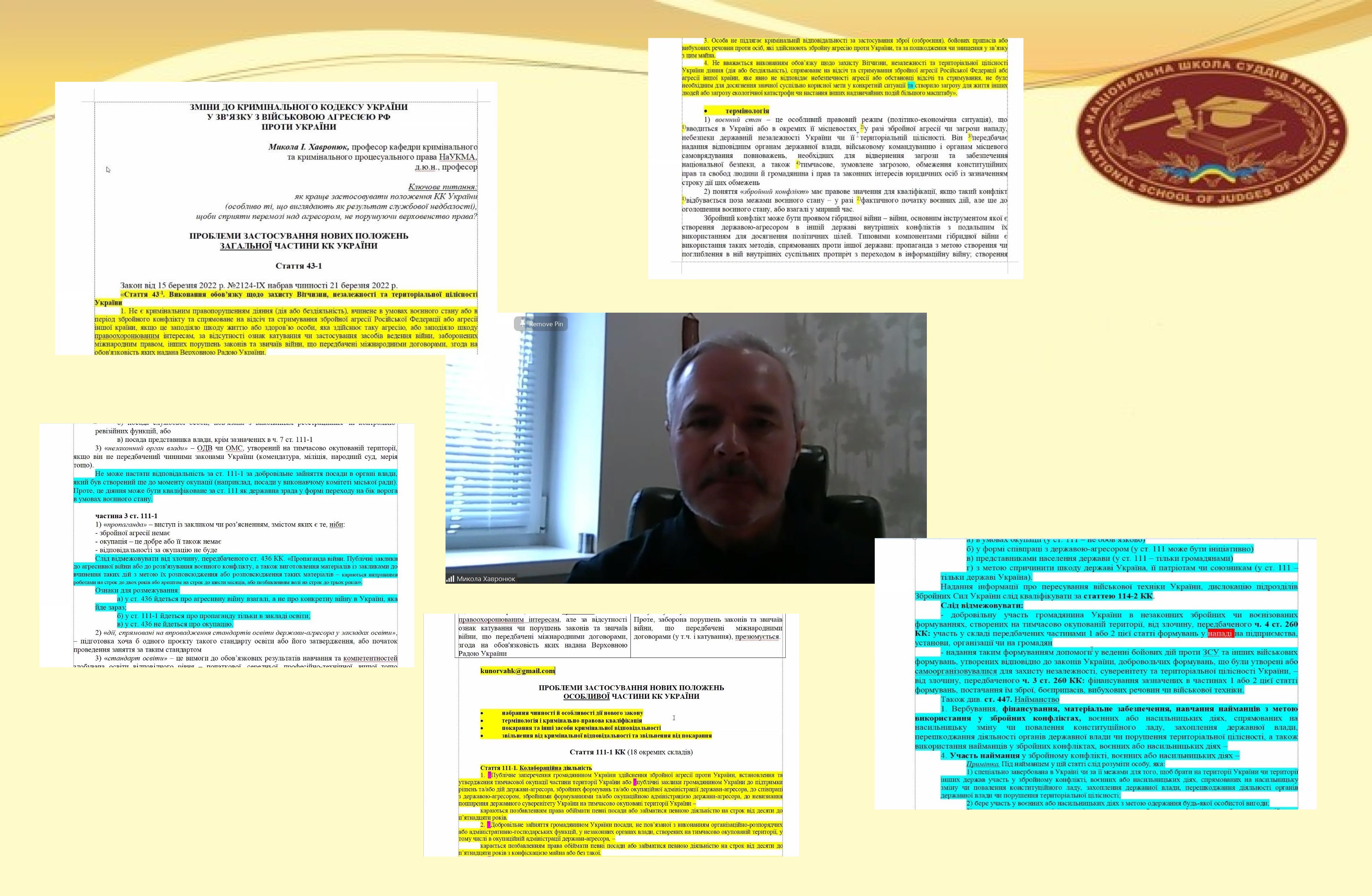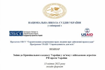 13 квітня 2022 року Національна школа суддів України у співпраці з Проєктом ОБСЄ "Гарантування дотримання прав людини при здійсненні правосуддя" та Програмою USAID "Справедливість для всіх" провела усеукраїнський онлайн–семінар для суддів місцевих загальних та апеляційних судів "Зміни до Кримінального кодексу України у зв’язку з військовою агресією РФ проти України". Захід викликав велику зацікавленість серед суддів, оскільки у його роботі взяли участь понад 350 слухачів.