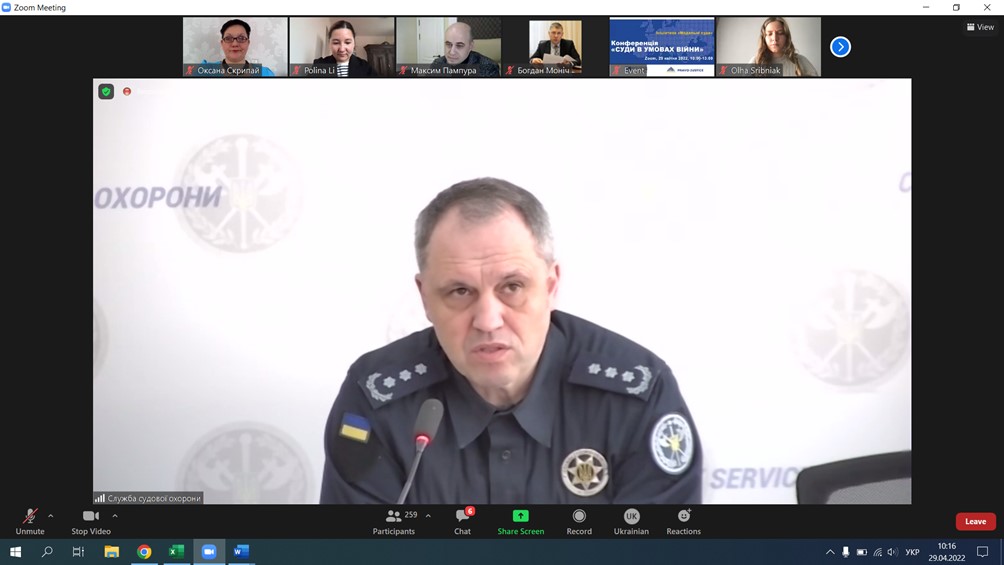 "На жаль, така тема для України сьогодні сприймається вже не як теорія, а виключно з практичних міркувань та позицій отриманого досвіду. У той же час, незважаючи на наш восьмирічний досвід життя в умовах збройного конфлікту та вжиття низки заходів, останні два місяці принесли для всіх нас багато нових тяжких та масштабних викликів, що потребують негайних дій та прийняття рішень. Саме тому для всіх нас надзвичайно цінним є практичний досвід учасників сьогоднішньої конференції", - відзначив т. в. о. заступника Голови Державної судової адміністрації України Максим Пампура 29 квітня 2022 року під час вітального слова на конференції "Суди в умовах війни".