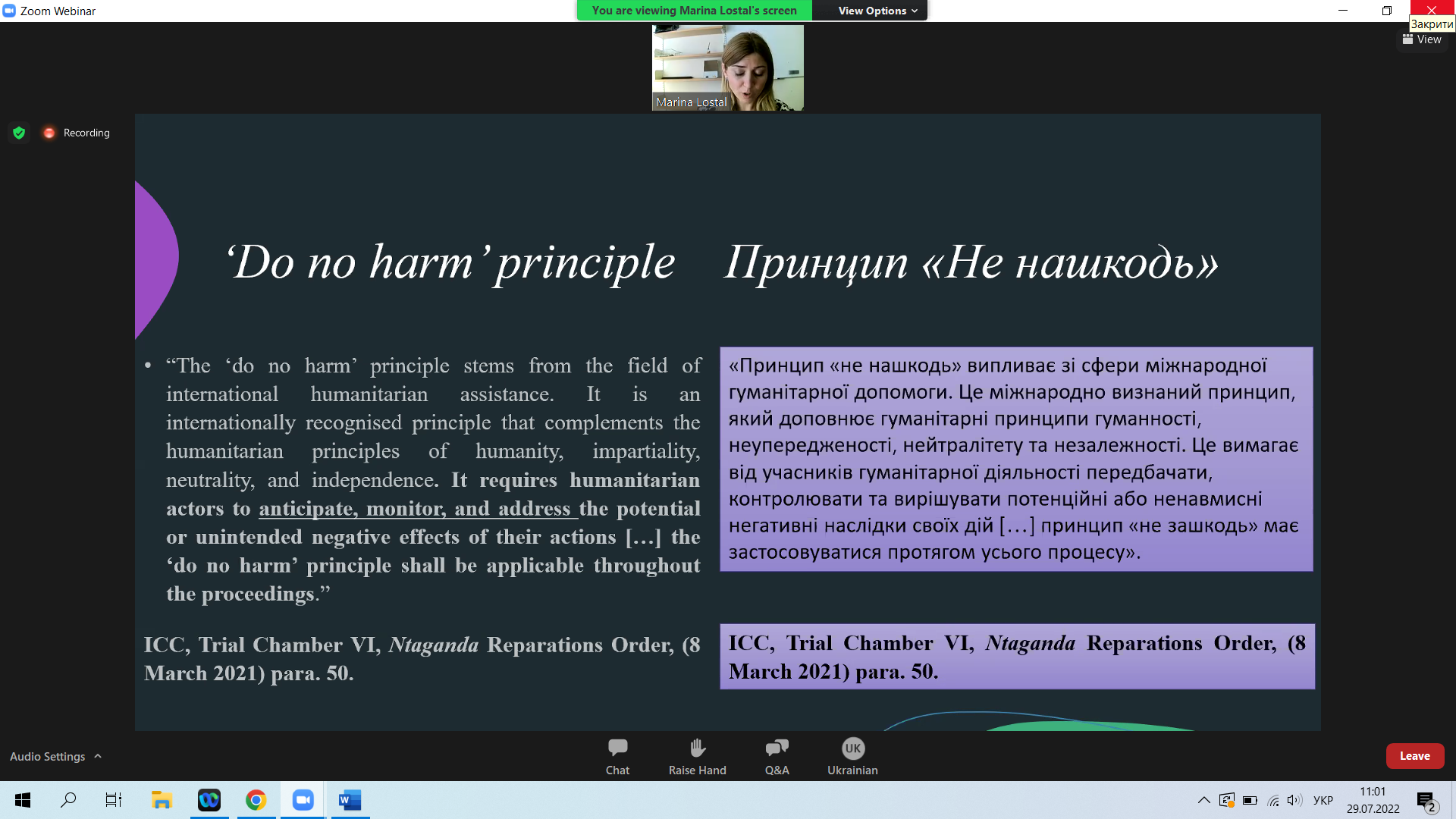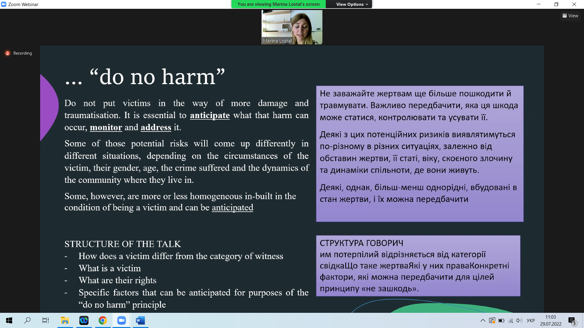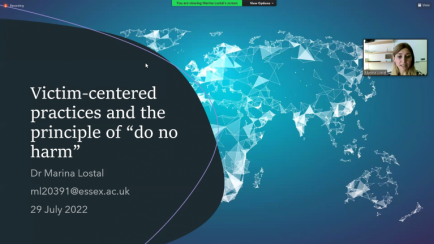 Під час конференції проаналізовано особливості підходів, орієнтованих на потерпілого, як в судових процесах, так і під час проведення інтерв’ю, розглянуто правовий статус жертв під час судових процесів, пов’язаних з воєнними злочинами, а також застосування принципу "не нашкодь".