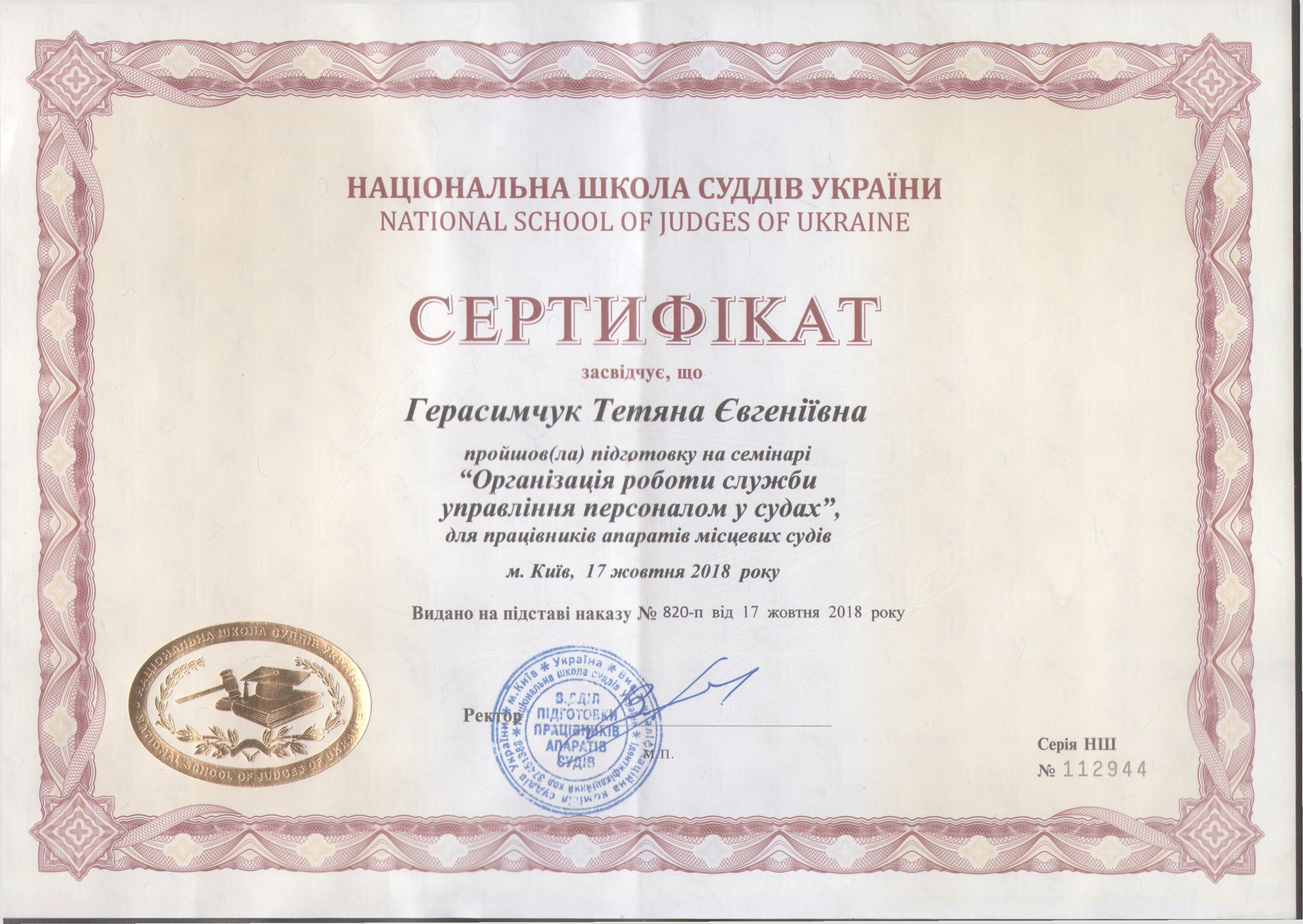 Керівник апарату(голова ліквідаційної комісії) Барського районного суду Вінницької області Герасимчук Тетяна Євгенівна відвідала даний семінар, про що отримала Сертифікат Національної школи суддів України.
