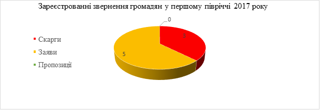 Також слід відмітити, що з 8 звернень, що надійшли у першому півріччі 2017 року було зареєстровано одне усне звернення.