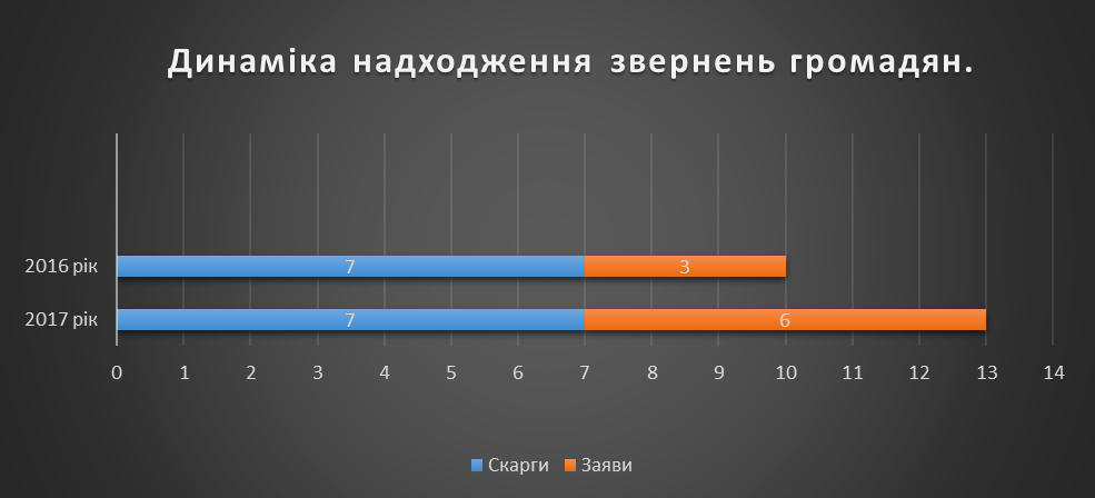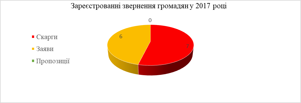 Також слід відмітити, що з 13 звернень що надійшли у 2017 році було зареєстровано одне усне звернення.