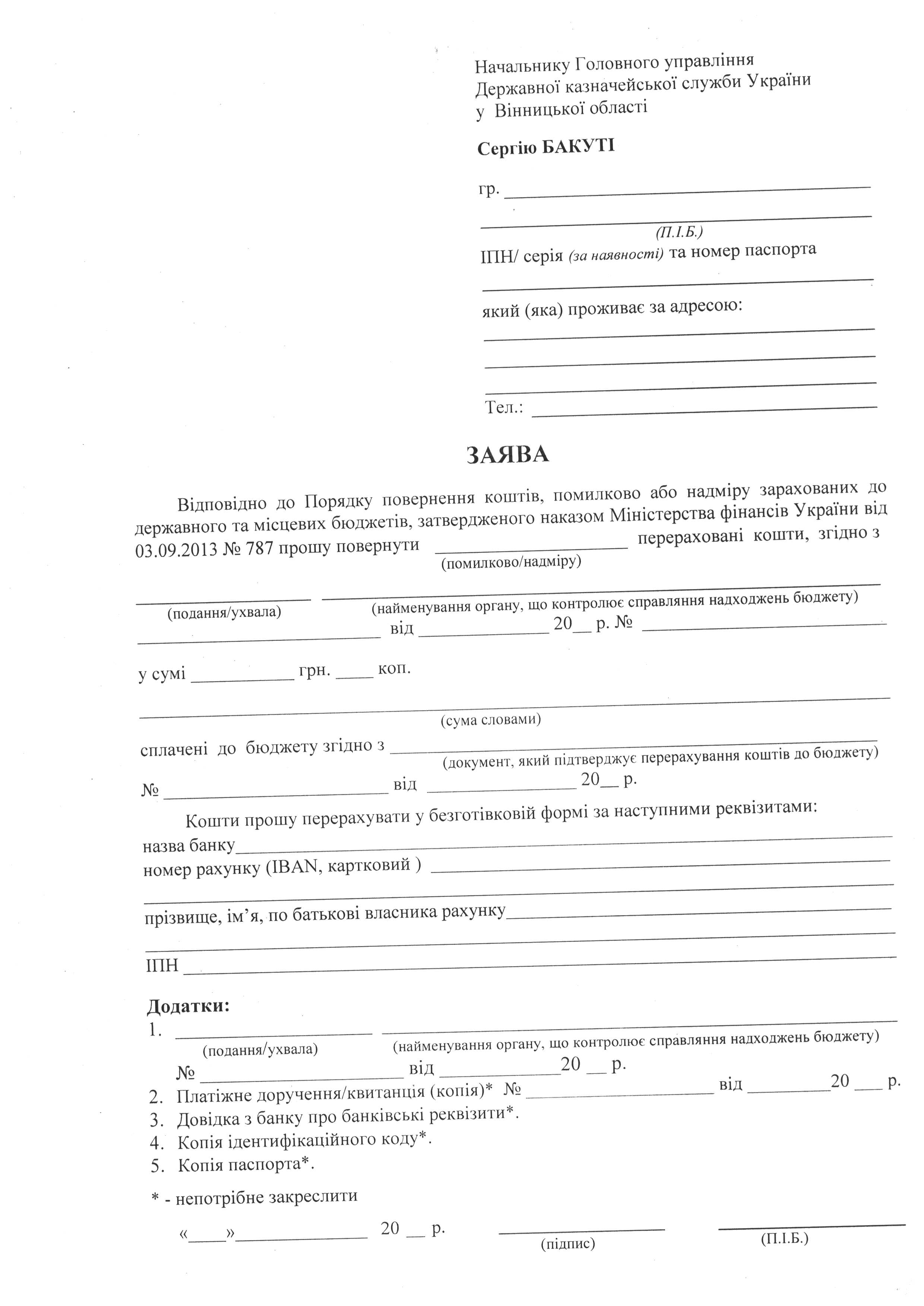 Форма бланка заяви про повернення коштів з державного та місцевих бюджетів