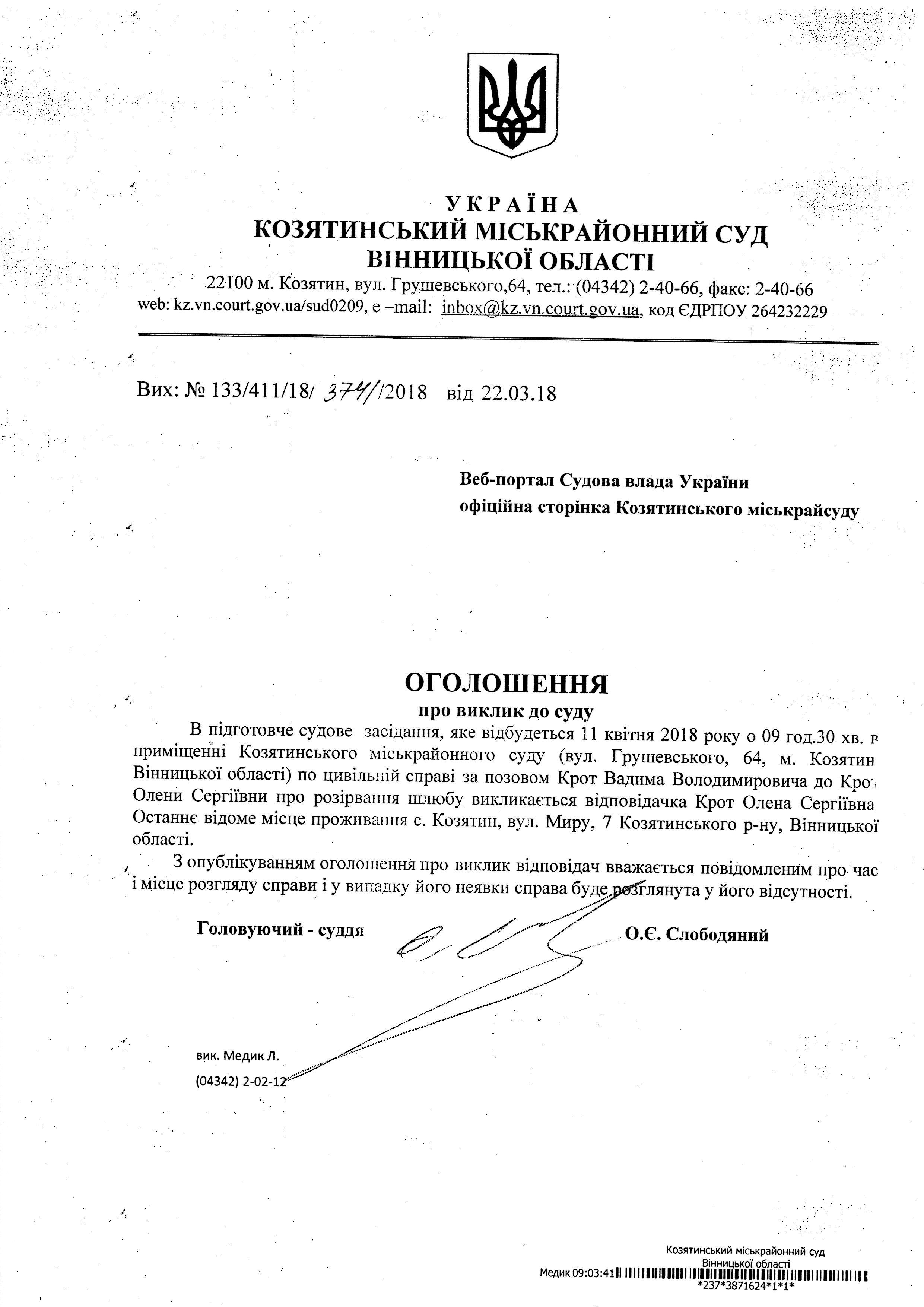 Виклик до суду Крот Олена Сергіївна