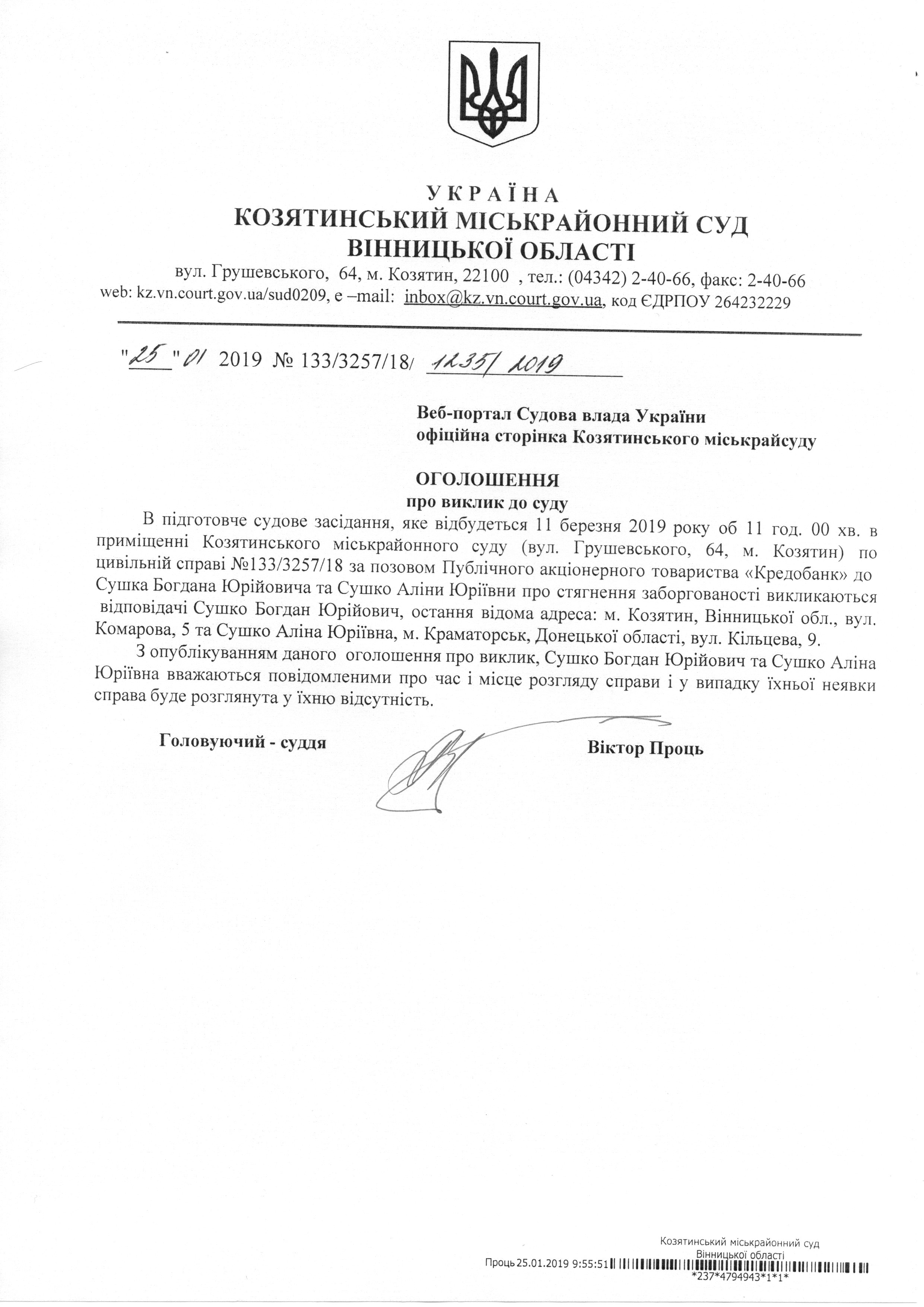 Виклик до суду Сушко Богдан Юрійович та Сушко Аліна Юріївна