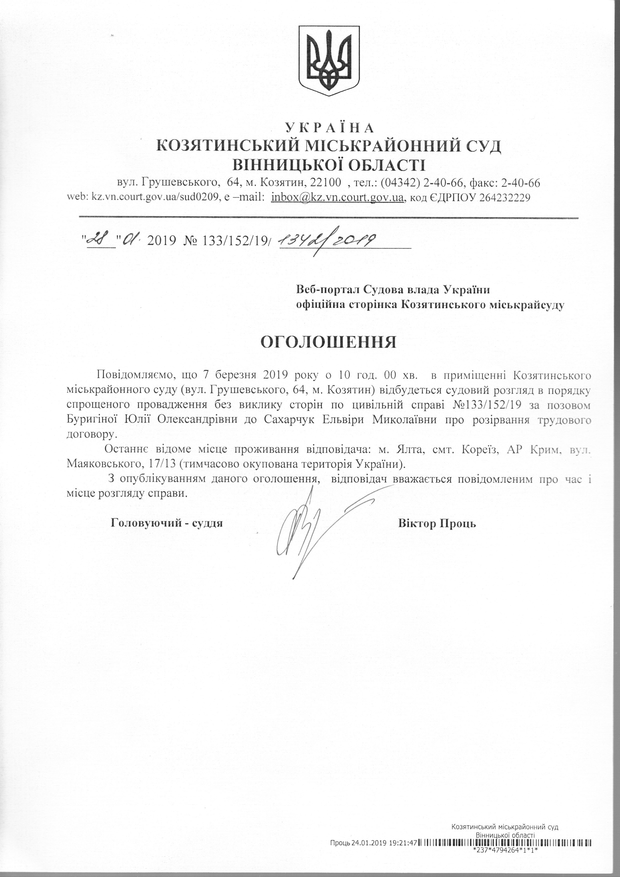 Виклик до суду Сахарчук Ельвіра Миколаївна