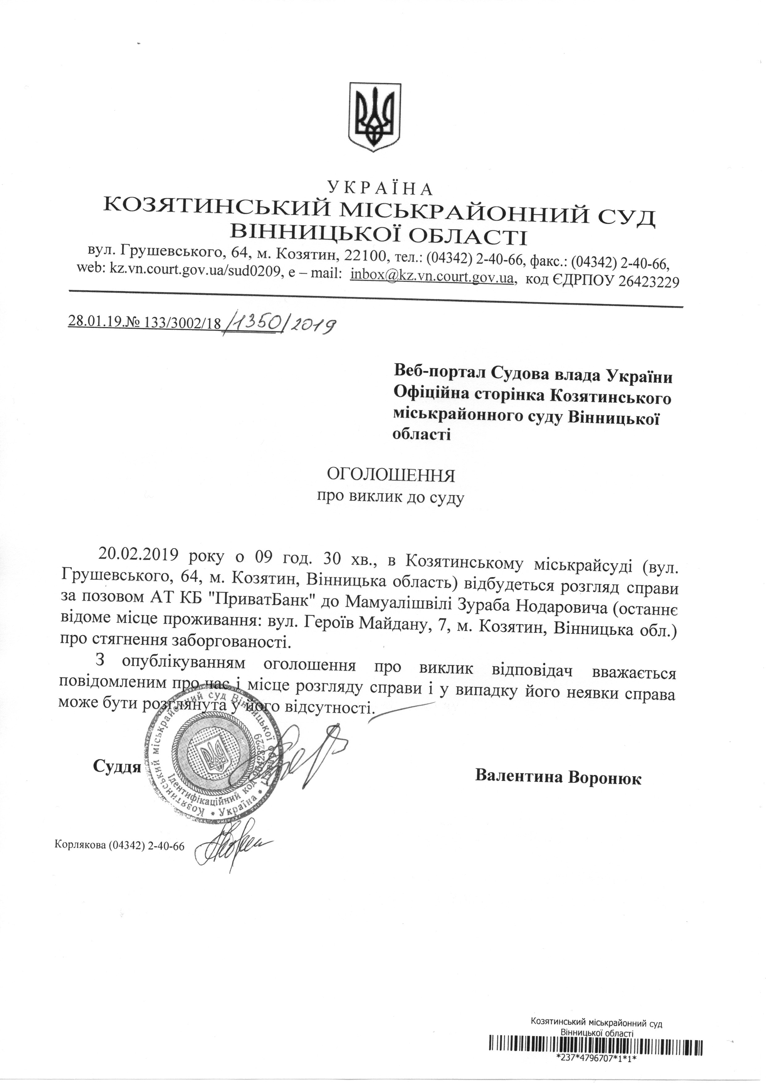 Виклик до суду Мамуалішвілі Зураба Нодаровича