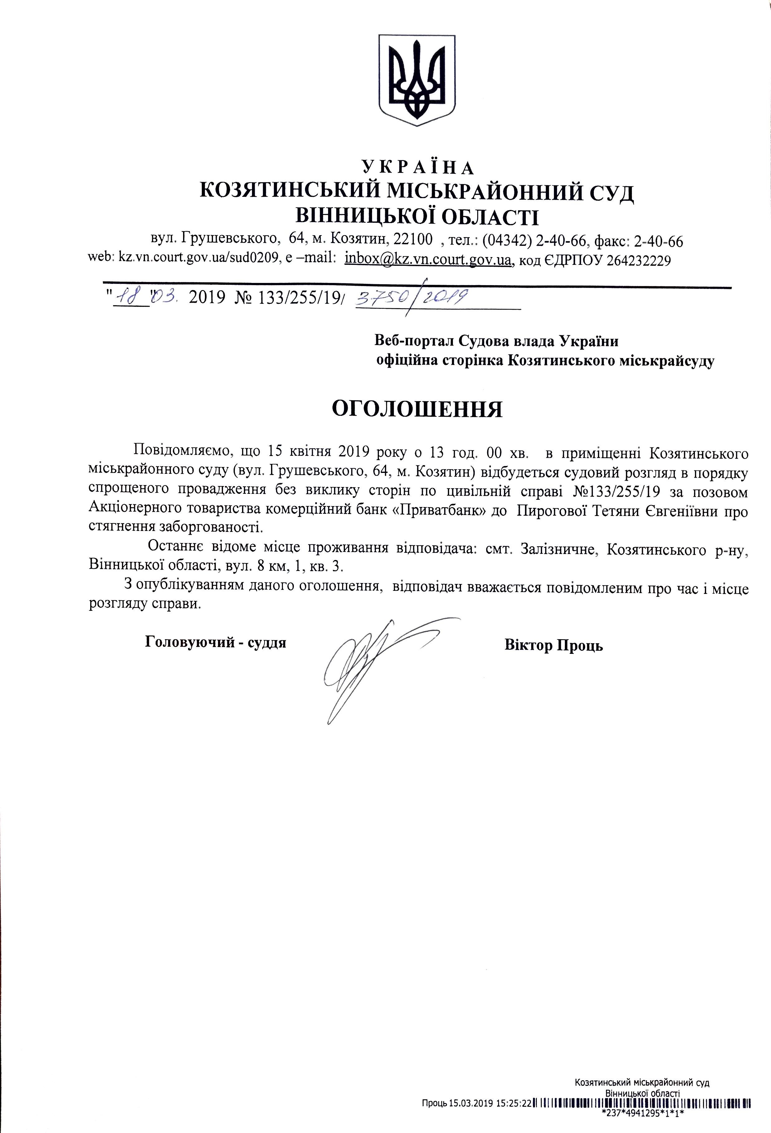 Виклик до суду Пирогової Тетяни Євгеніївни