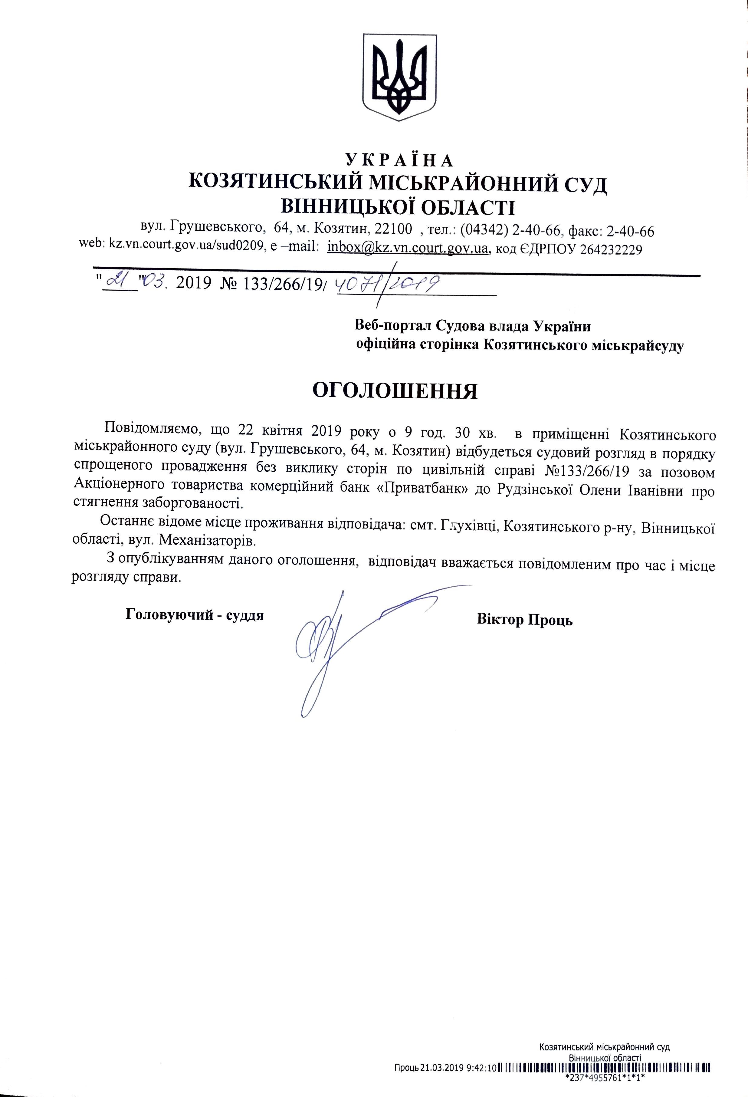 Виклик до суду Рудзінської Олени Іванівни