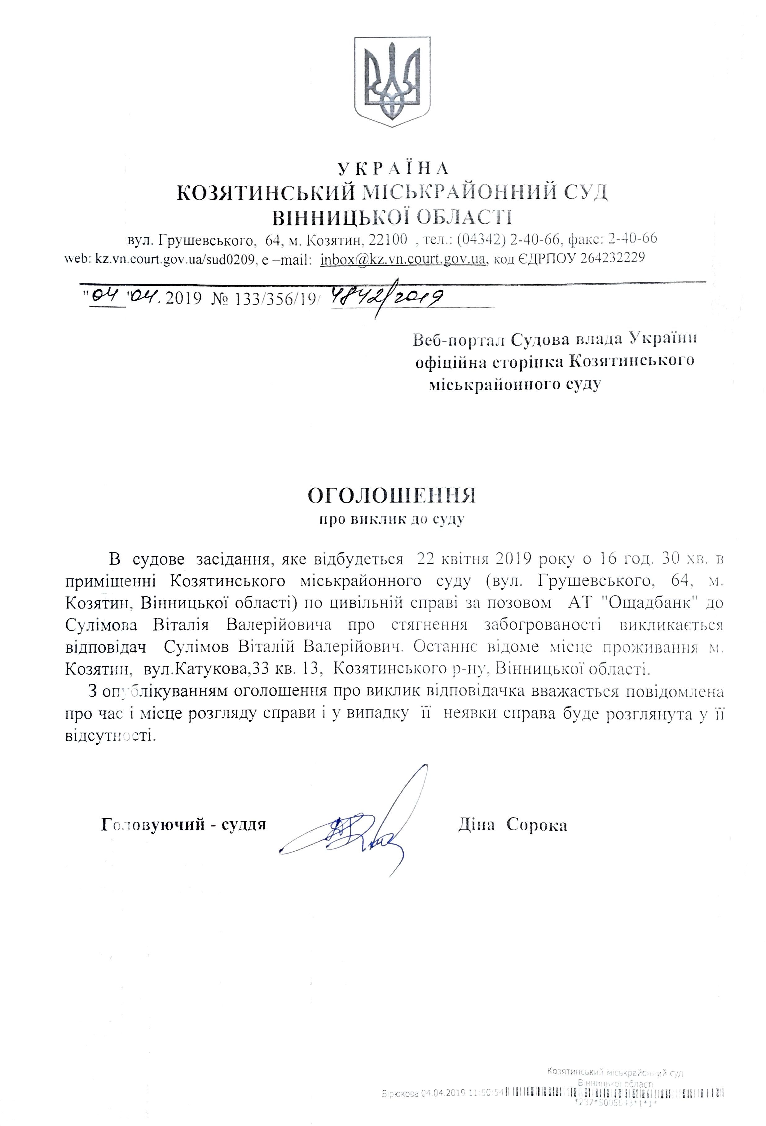 Виклик до суду Сулімов Віталій Валерійович