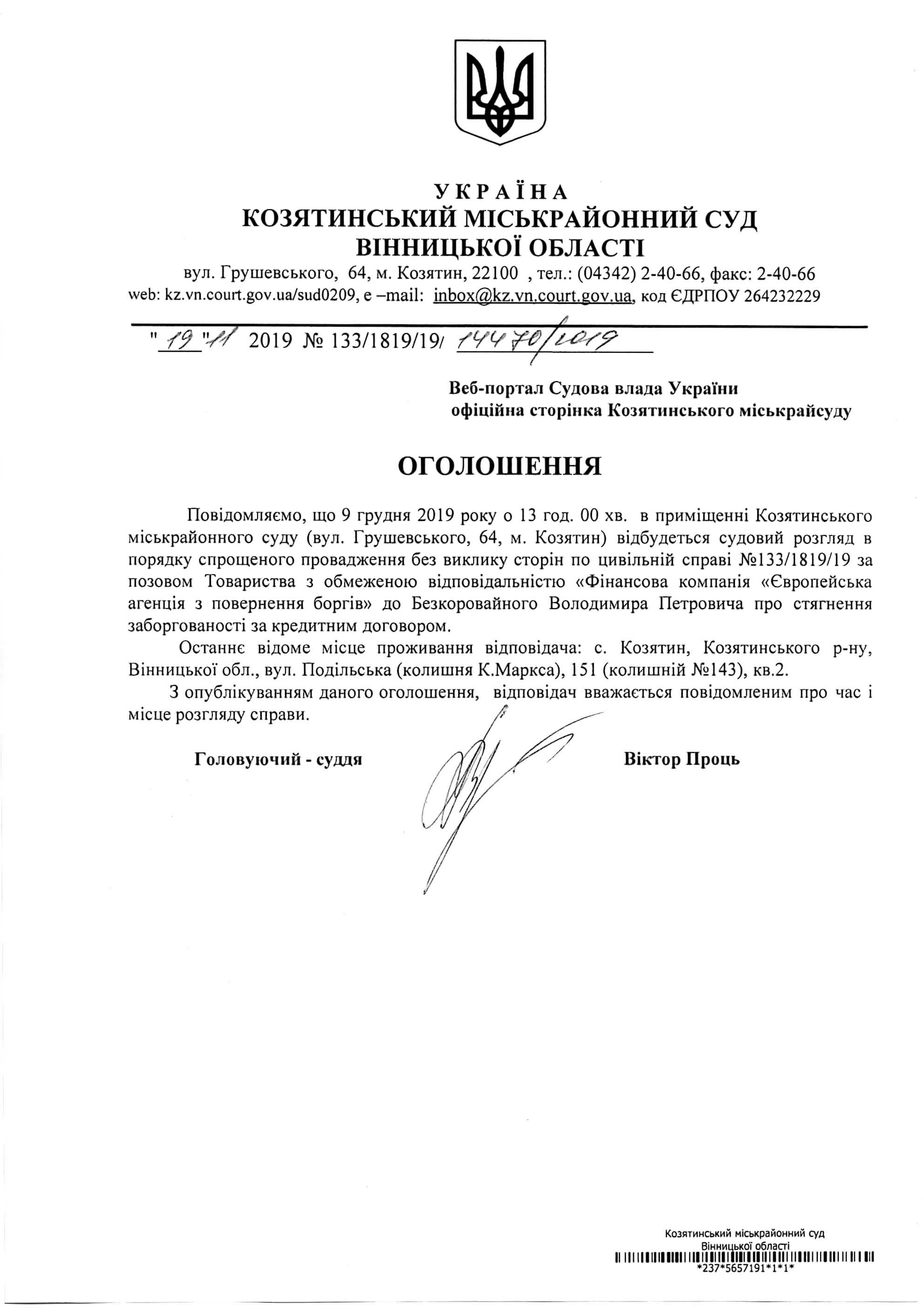 Виклик до суду Безкоровайного Володимира Петровича