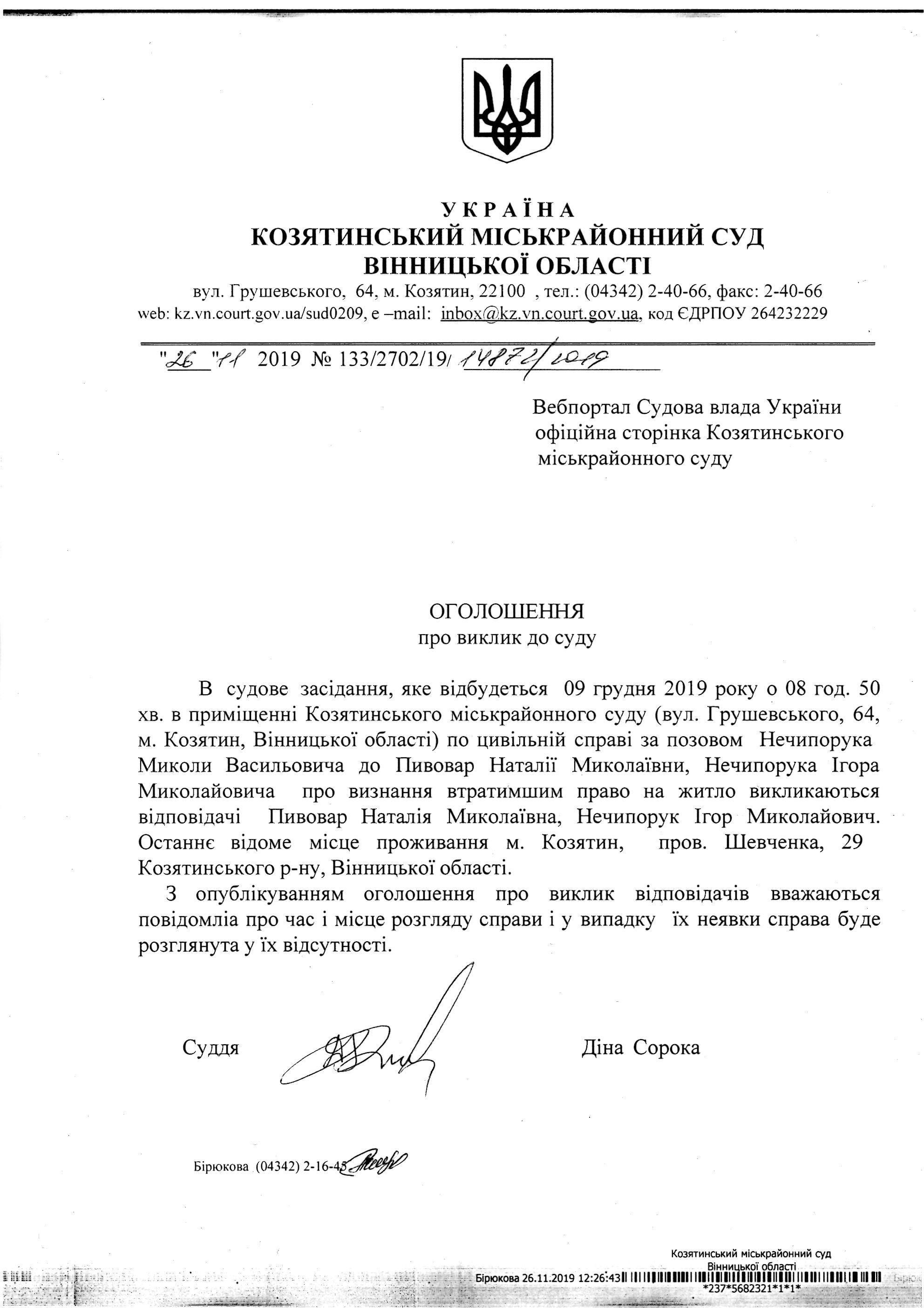 Виклик до суду Пивовар Наталія Миколаївна та Нечипорук Ігор Миколайович