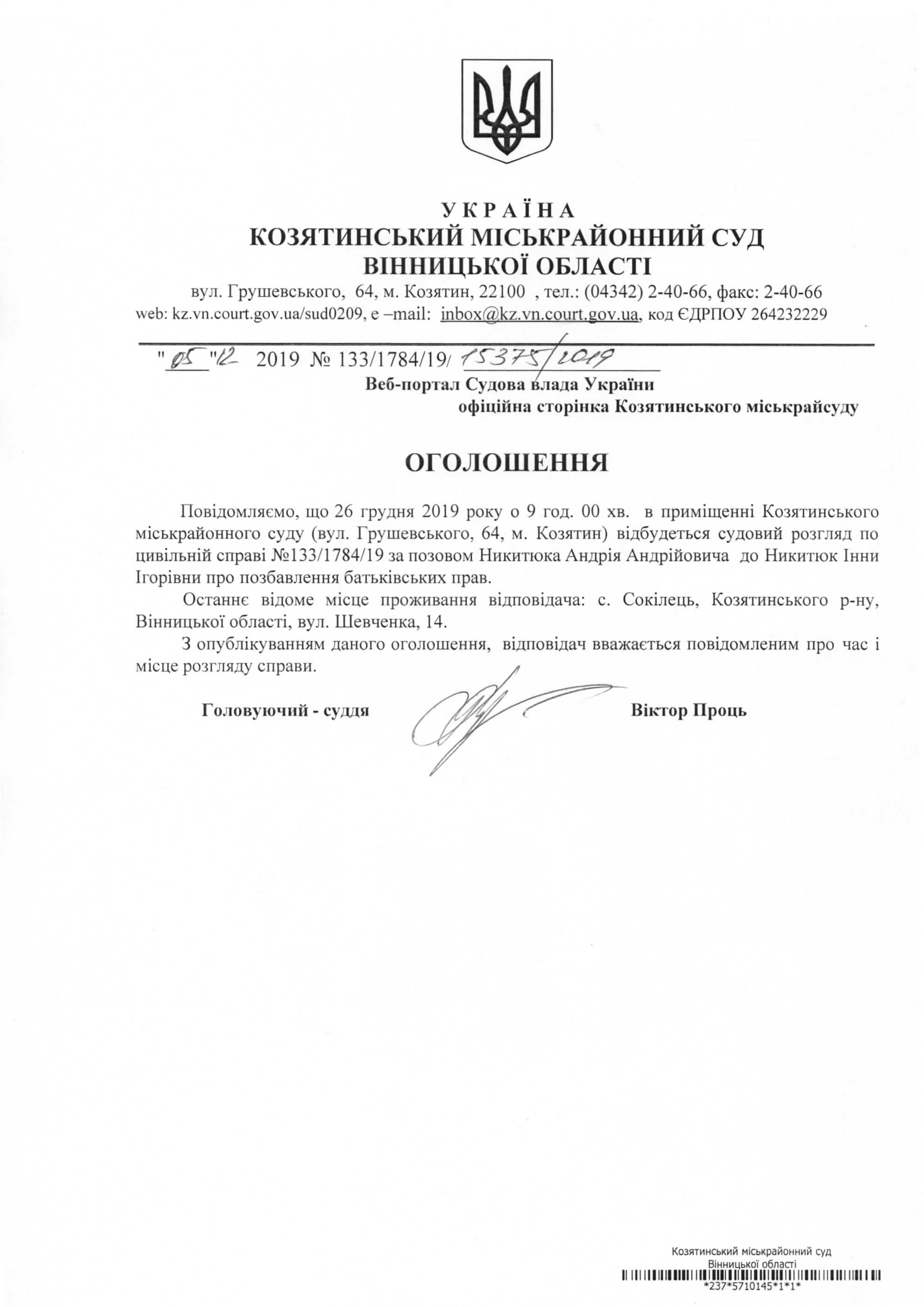 Виклик до суду Никитюк Інни Ігорівни