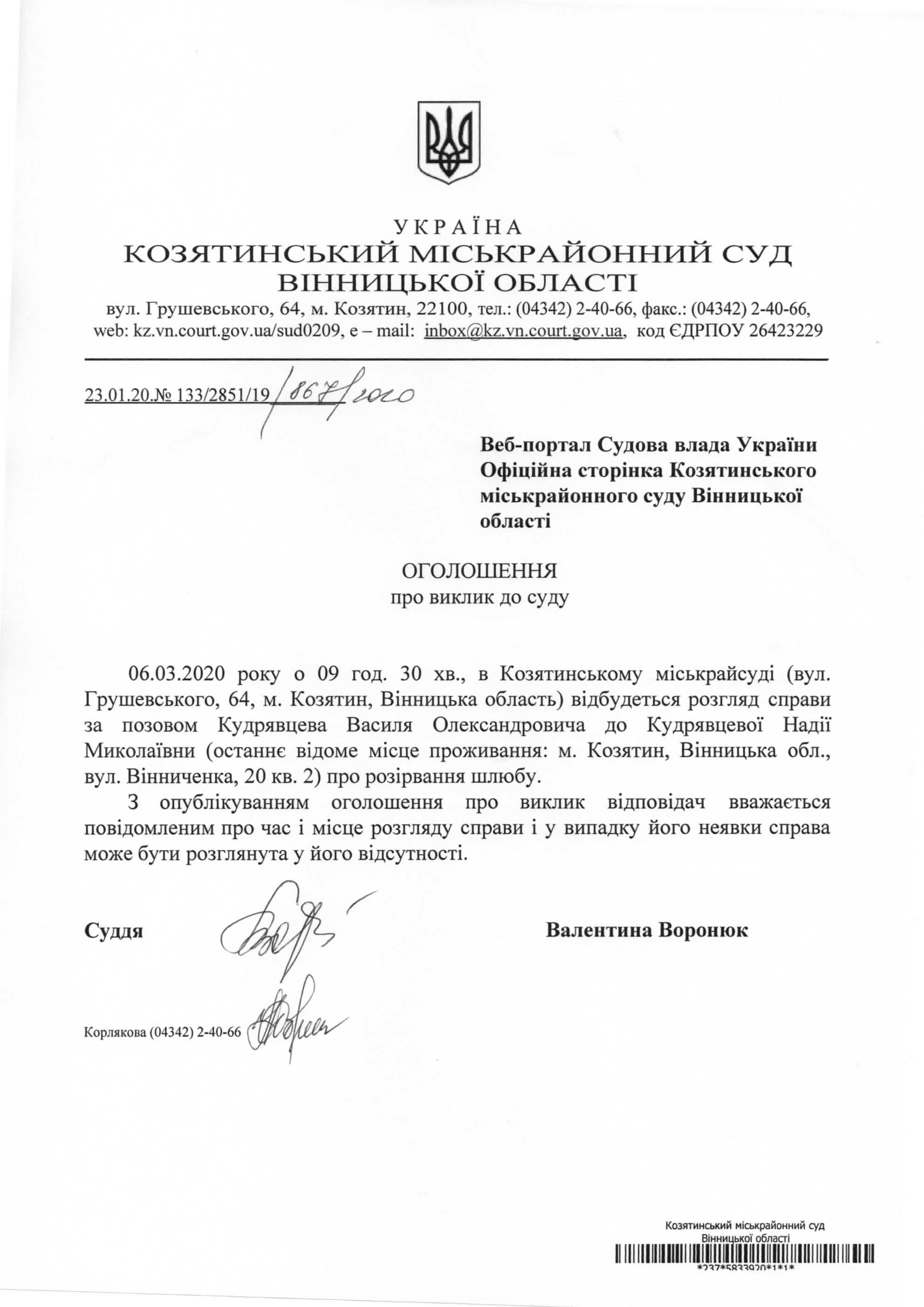Виклик до суду Кудрявцевої Надії Миколаївни