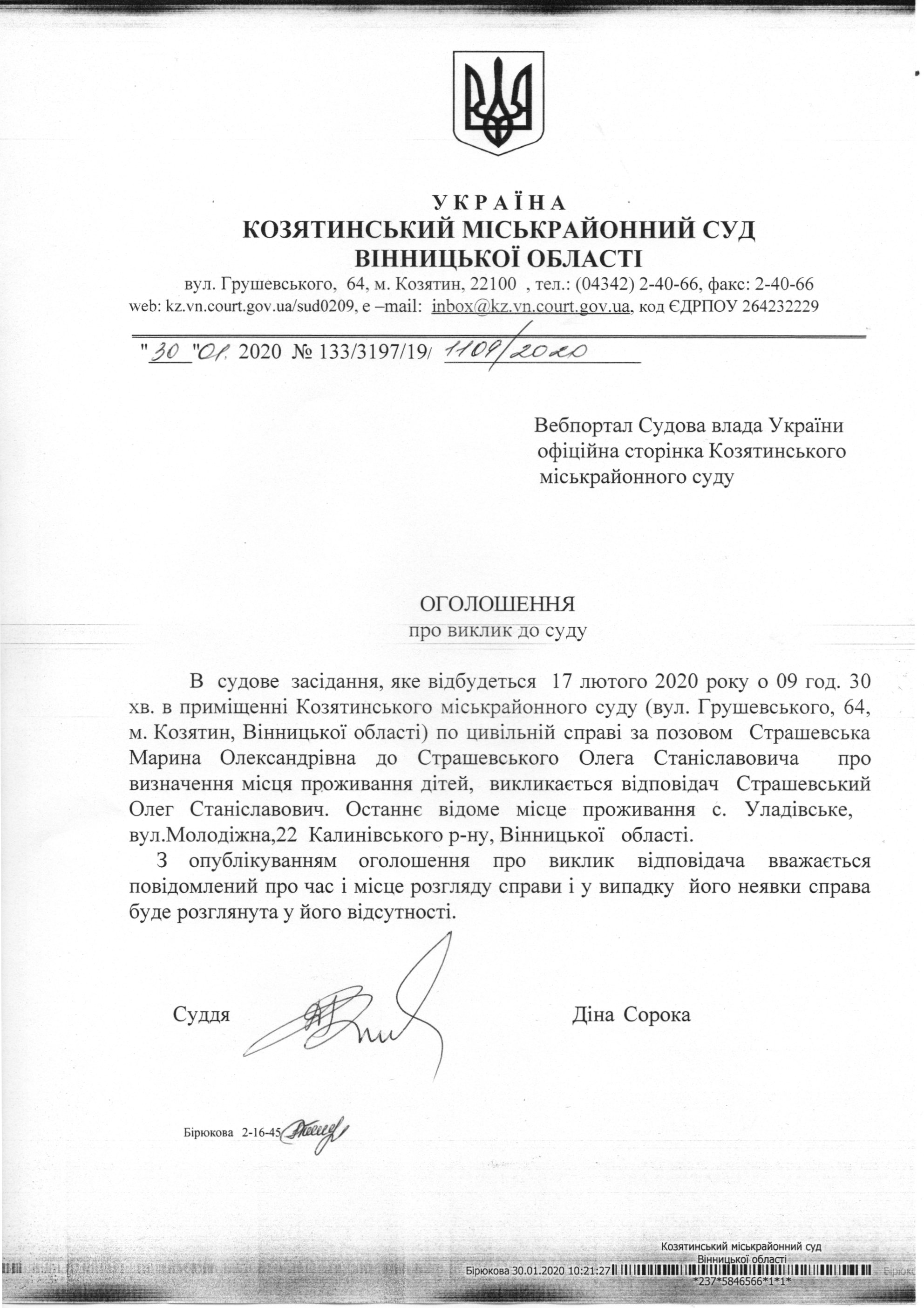 Виклик до суду Страшевський Олег Станіславович