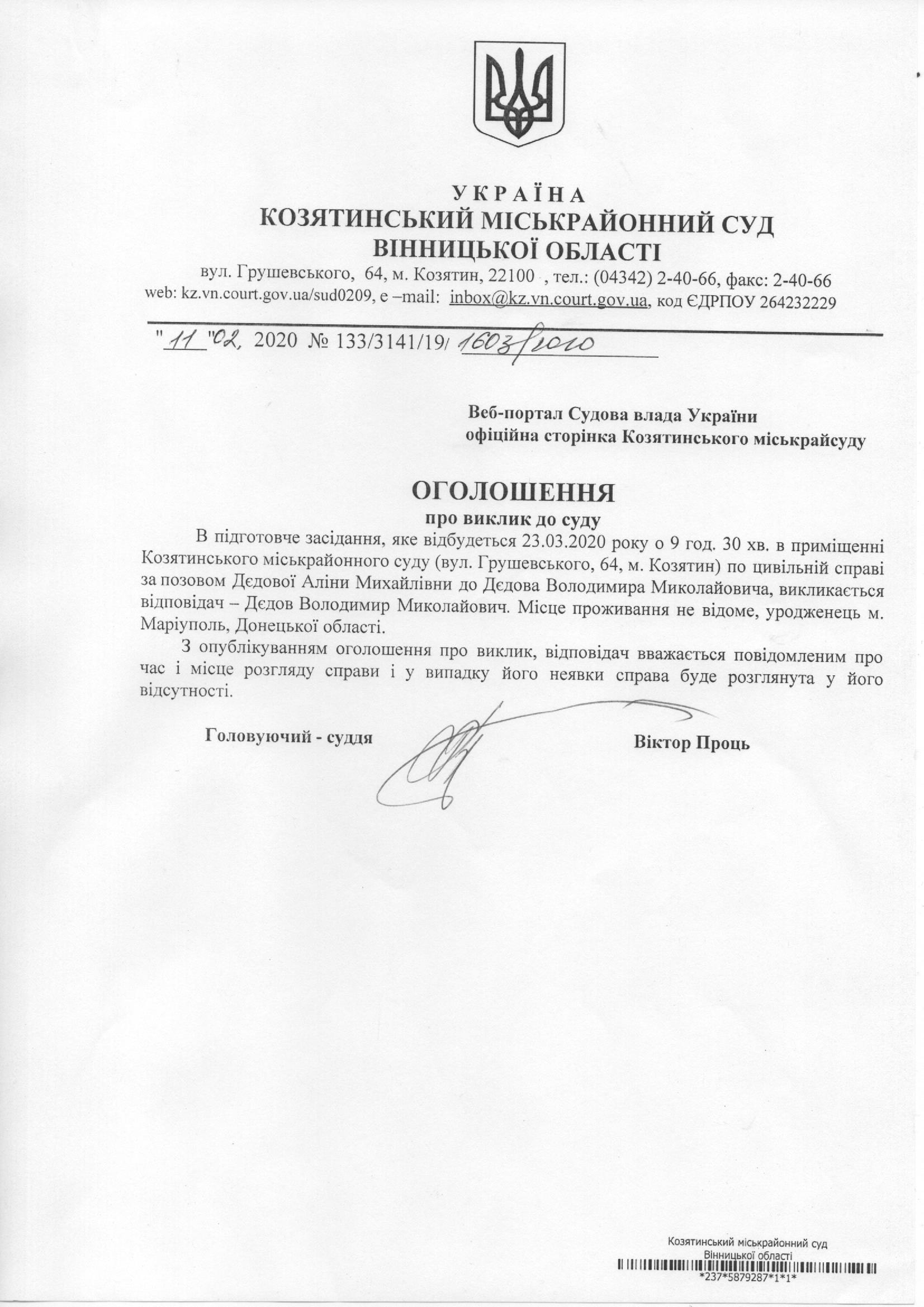Виклик до суду Дєдов Володимир Миколайович