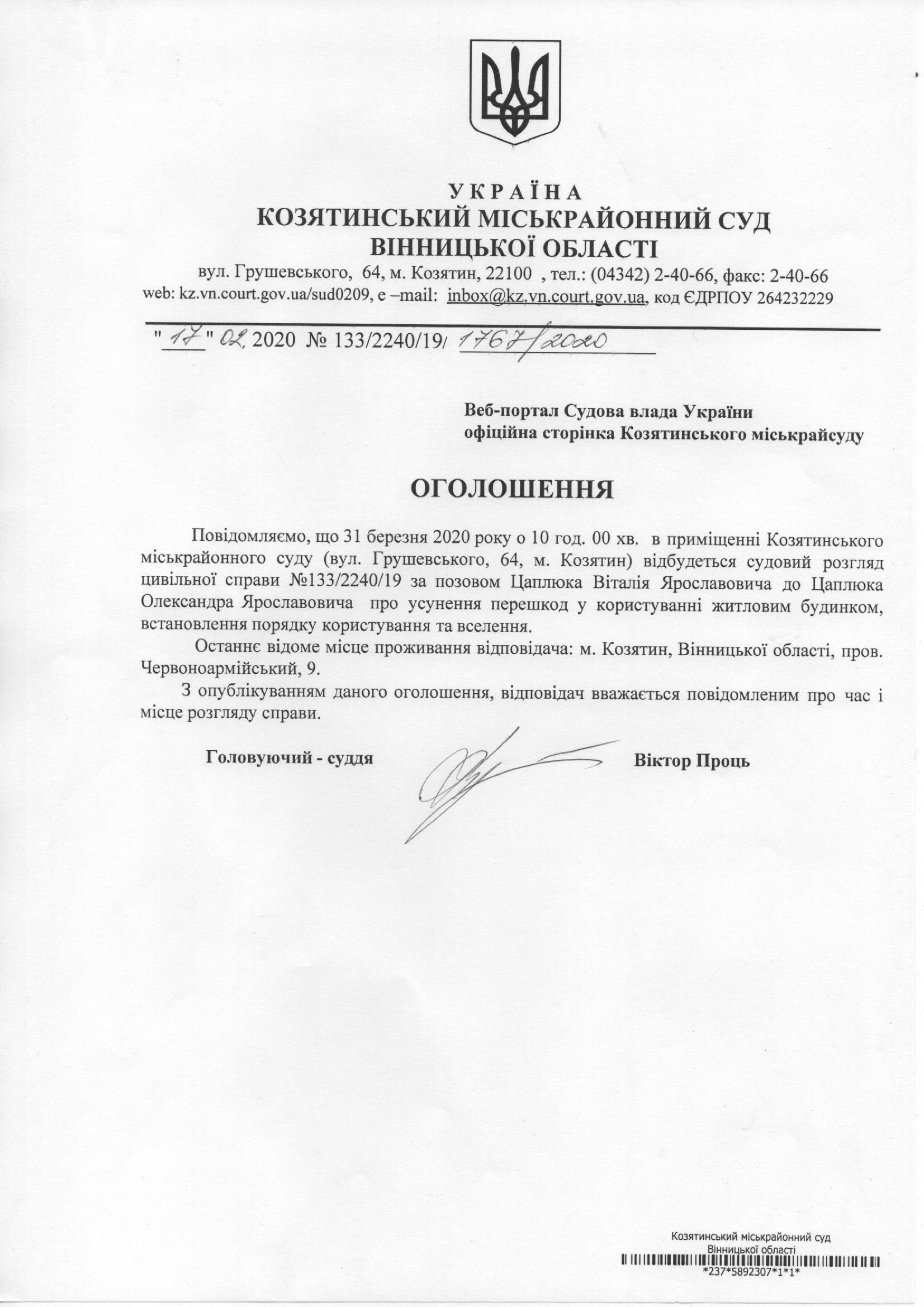 Виклик до суду Цаплюка Олександра Ярославовича
