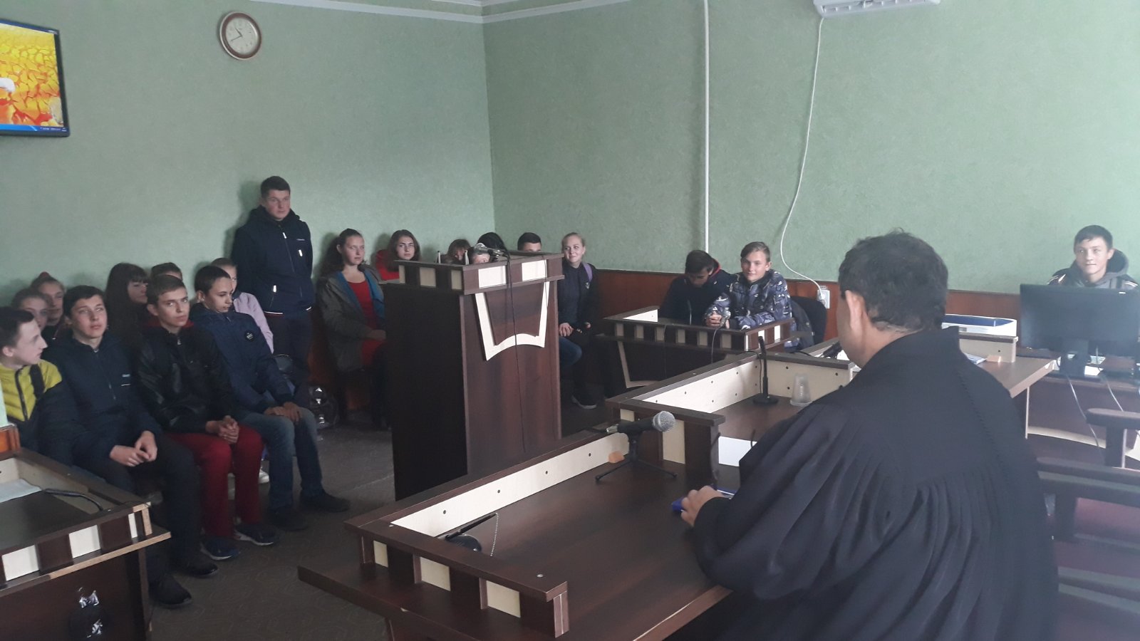 У залі судового засідання в.о. голови суду Желіховський В.М. розповів про розміщення сторін судового процесу, як поводити себе під час слухання справи, під час перебування в суді, які існують негативні наслідки порушення правил поведінки в суді, а також відповідав на запитання, які ставили учні.