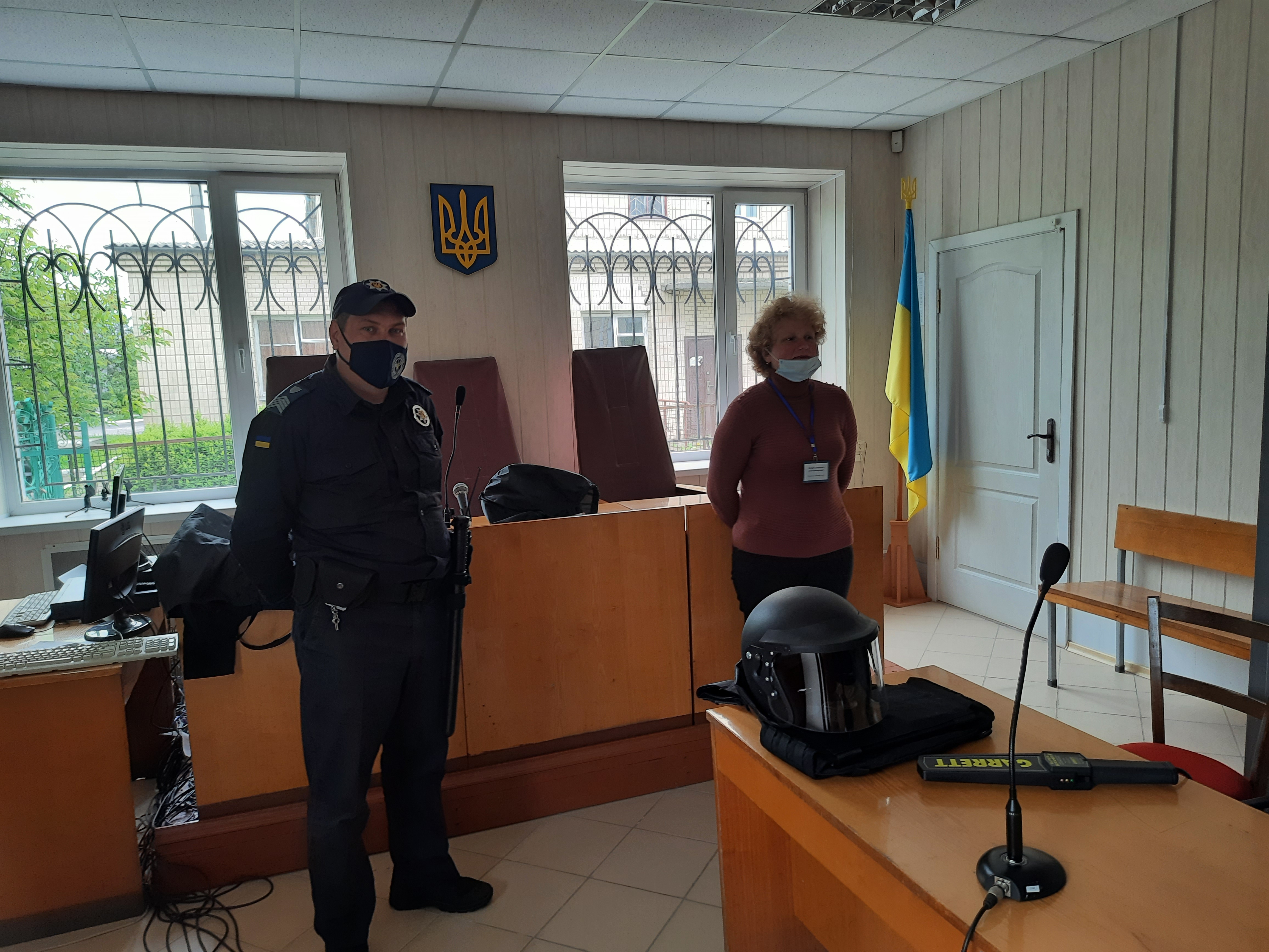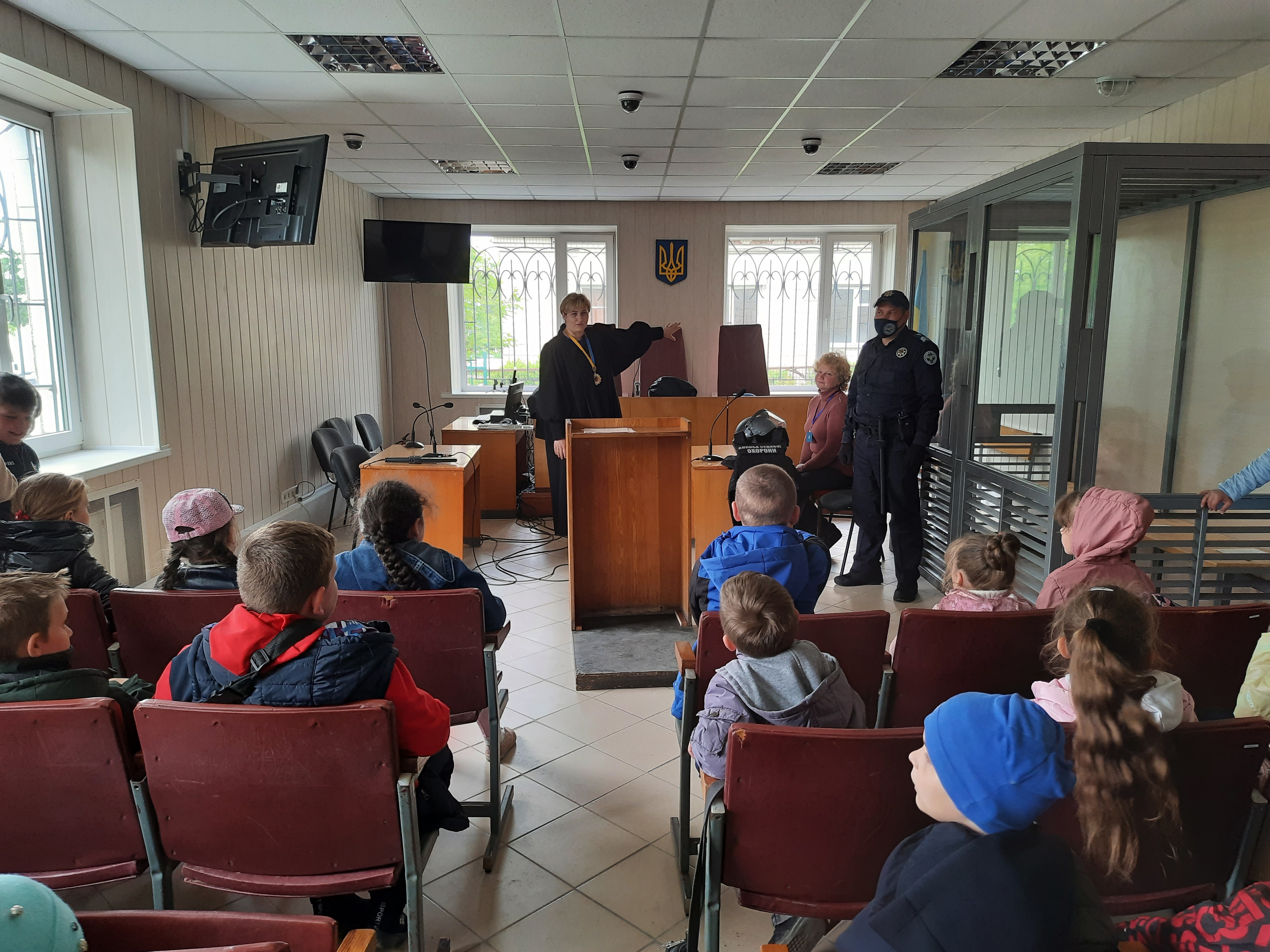 Ознайомлення з роботою суду відбулося в залі судового засідання, де учасникам заходу розповіли про загородження, яке відокремлює обвинувачених (підсудних), засуджених від складу суду та присутніх, що відповідає європейським стандартам.