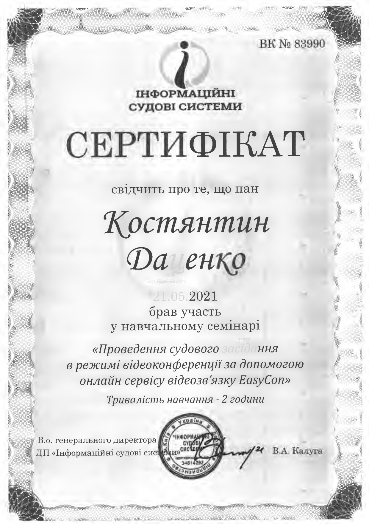21 травня 2021 року секретар судового засідання Любов Хонькович, заступник керівника апарату, на якого покладено обов’язки секретаря судового засідання Інна Боржемська, та головний спеціаліст (з інформаційних технологій) Кocтянтин Дaцeнкo пройшли навчальний семінар по роботі з програмою проведення судового засідання в режимі відеоконференції за допомогою онлайн сервісу відеозв’язку ЕаsyCon, який проводився Державним підприємством «Інформаційні судові системи» в дистанційному режимі.