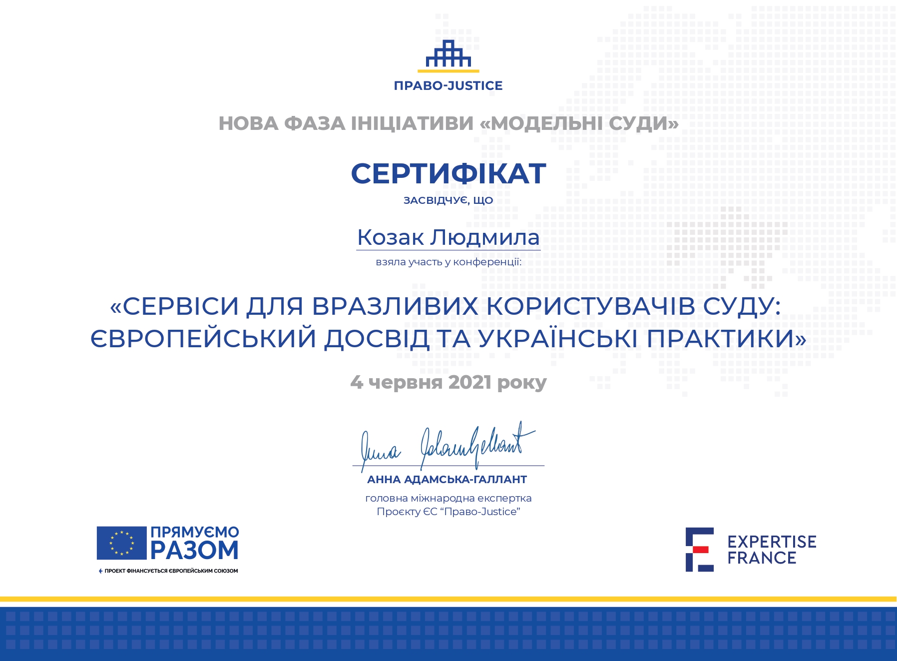 04 червня 2021 року керівник апарату суду Людмила Козак та консультант суду (по роботі з персоналом) Аліна Лісевич долучилися до проєкту Європейського Суду «Право - Justice» та взяли участь у конференції «Сервіси для вразливих користувачів суду: європейський досвід та українські практики» в межах імплементації нової фази «Модельні суди».