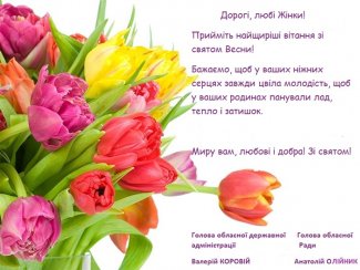 Шановні жінки вітаємо Вас з Міжнародним жіночим днем і хочемо побажати в чудове свято поваги і розуміння від колег, захоплення від оточуючих, любові й теплоти від рідних сердець, задоволення і насолоди від життя, приємних сюрпризів та добрих подарунків від долі. Бажаємо справжнього жіночого щастя і нев'янучої чудової краси.