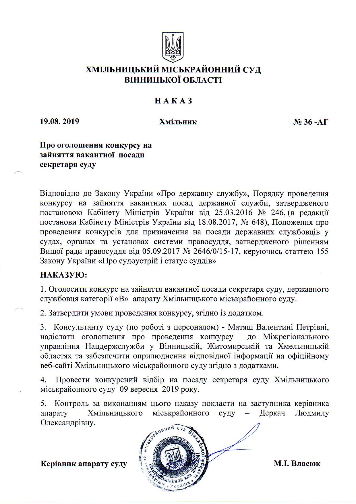 від 19 серпня 2019 року № 36 - АГ