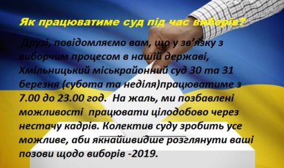 Друзі, повідомляємо вам, що у зв’язку з виборчим процесом в нашій державі, Хмільницький міськрайонний суд 30 та 31 березня (субота та неділя)працюватиме з 7.00 до 23.00 год. На жаль, ми позбавлені можливості працювати цілодобово через нестачу кадрів. Колектив суду зробить усе можливе, аби якнайшвидше розглянути ваші позови щодо виборів -2019.
