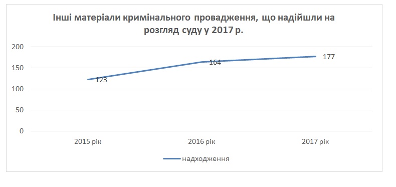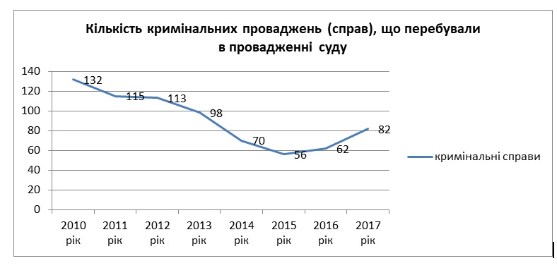 На протязі 2010 р. – 2014 р. мало місце однакове навантаження на суддів при розгляді кримінальних справ, тоді як уже починаючи з 2015 року спостерігалось збільшення надходжень матеріалів кримінального провадження. Так, середньомісячне навантаження у 2017 році у порівнянні з 2015 роком збільшилось на 1 справу (матеріал). Слід відмітити тенденцію, що хоча кримінальних проваджень на розгляд суду надходить і менше, показник інших матеріалів кримінального провадження (клопотань, скарг, заяв), що надійшли до суду – збільшується.