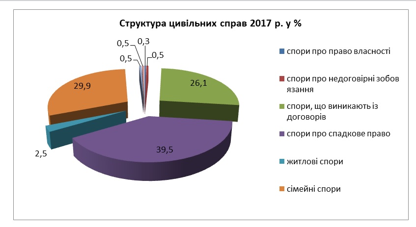 Загалом слід сказати, що структура цивільних справ в порівнянні з попередніми роками суттєво не змінилась. Схожа картина щодо структури спостерігається і загалом по Україні