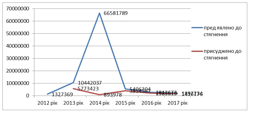 Позивачами усього до стягнення було пред’явлено позовів на суму 1897734 грн., що на 914939 грн. або 33% менше ніж у 2016 році, з яких присуджено до стягнення 1416176 грн., в тому числі моральної шкоди – 2000 грн.