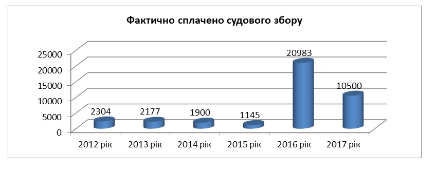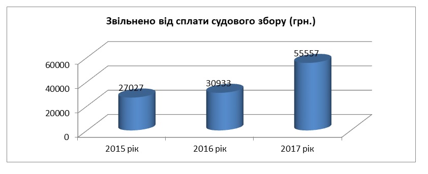 Сума судового збору сплачена при подачі заяв у поточному році склала 119989 грн. По 83 (-1) справах заявників було звільнено від сплати судового збору відповідно до встановлених законодавством пільг на загальну суму 23116 (+ 2343) грн.