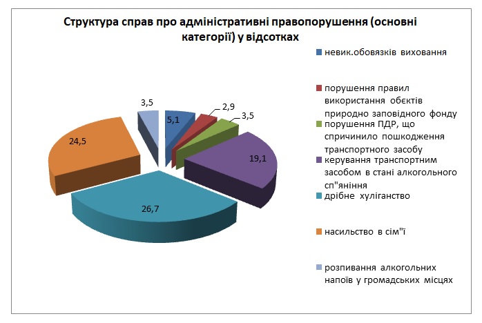 Розглянуто 275 справ і матеріалів про адміністративні правопорушення стосовно 275 осіб, повернуто 35 матеріала, із них 32 – для належного оформлення. Закінчено провадження у 98,4 % (310) справ і матеріалів.
