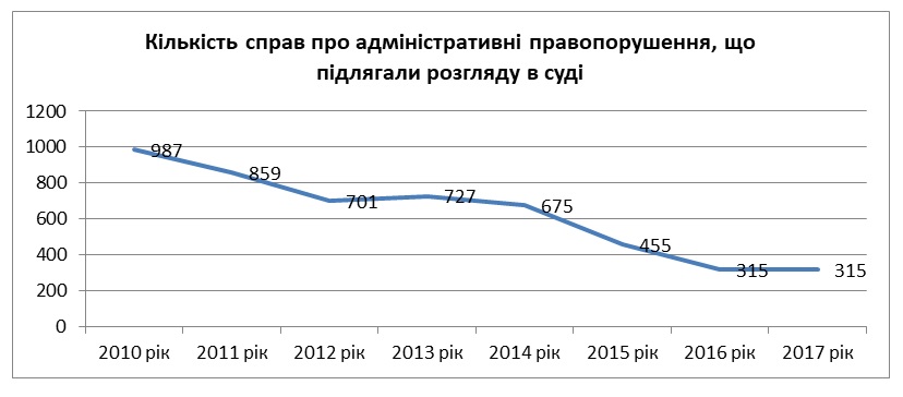 У 2017 році на розгляді місцевого суду знаходилось 315 справ та матеріалів про адміністративні правопорушення, що є абсолютно аналогічним показником відносно минулого року.