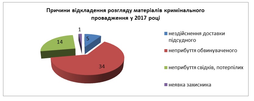 У 2017 році не було зафіксовано випадків відкладення розгляду кримінального провадження через неявку прокурора, при цьому мав місце 1 випадок відкладення розгляду через неявку захисника, тоді як у 2016 році випадків неявки прокурора та (або) захисника не було. Разом з цим, у 2016 році справи не відкладались через нездійснення доставки до суду підсудного, який тримається під вартою, тоді як у 2017 році справи у 5 випадках відкладались в силу даної причини.