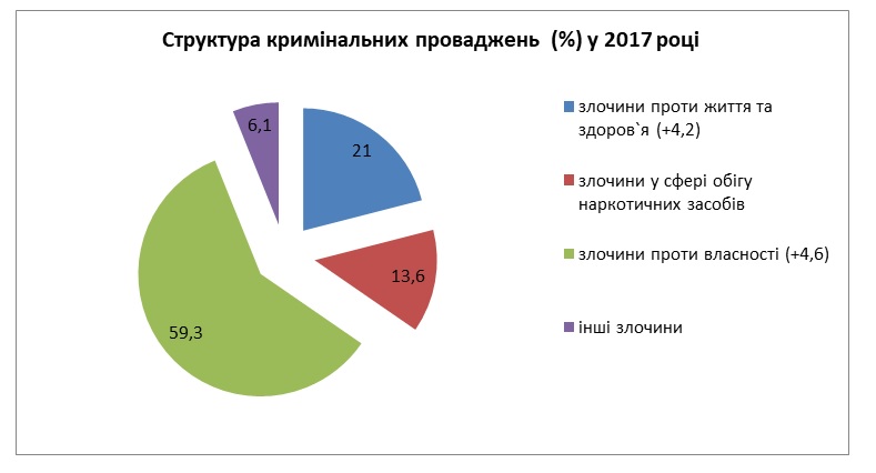 Як бачимо в структурі злочинів найбільше місце займають злочини проти власності та злочини проти життя і здоров’я особи, хоча раніше другими по кількості були злочини у сфері обігу наркотичних засобів, психотропних речовин їх аналогів або прекурсорів, причому такий розподіл був звичним уже на протязі кількох років. Слід також відмітити, що починаючи з 2014 року спостерігається збільшення злочинів проти життя та здоров’я.