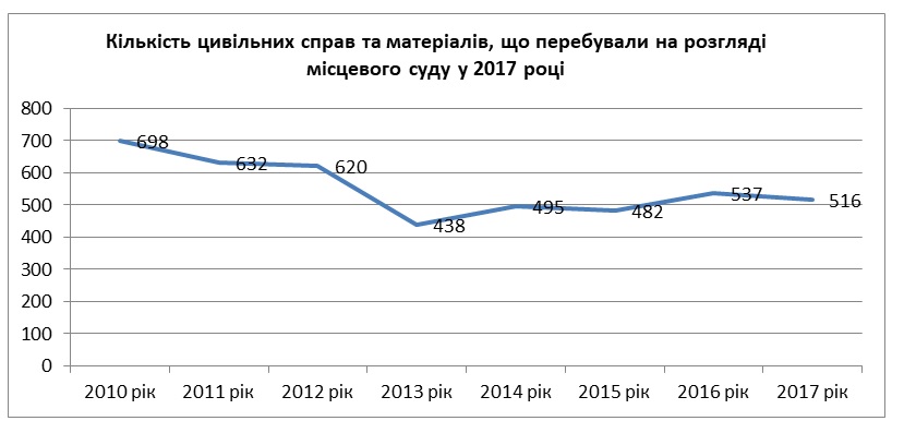 В провадженні суду перебувало 395 справи позовного провадження, що на 29 справ менше в порівнянні з минулим роком, з яких усього розглянуто – 362 (91,7%), в тому числі із ухваленням рішення – 318 (80,5%), із закриттям провадження у справі – 13 (3,3%), залишено без розгляду – 29 (7,4%) та 90 (у 2016 - 93) справи окремого провадження, з яких усього розглянуто – 82 (91,1 %), в тому числі із ухваленням рішення – 73 (81,1%), залишено без розгляду – 6 (6,7%).