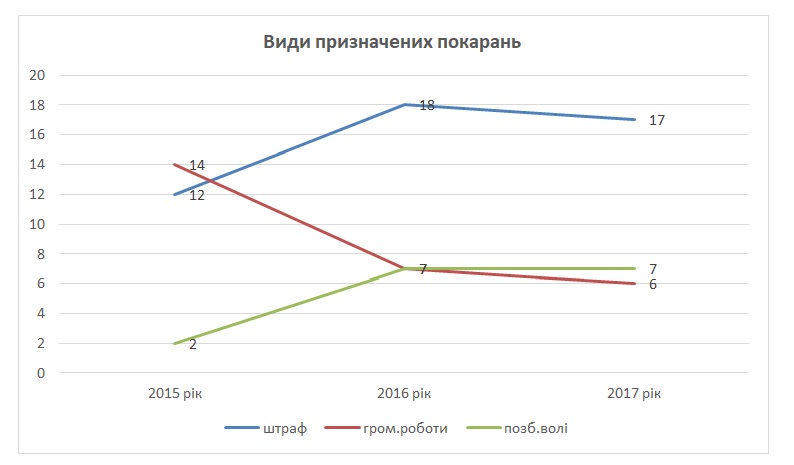 Найчастіше підсудних притягували до кримінальної відповідальності у виді позбавлення волі із застосуванням ст.75 КК України, а також у виді штрафу. Сума присуджених штрафів склала 16626 грн.