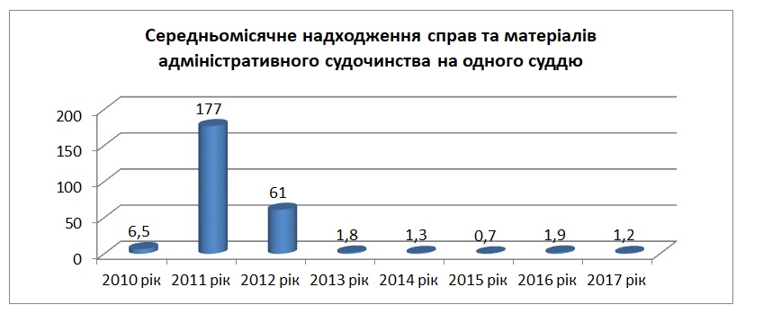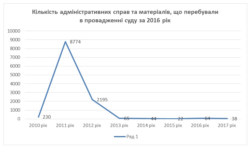Як вбачається з наведеної нижче діаграми у 2014 – 2017 роках спостерігалось загалом стабільне навантаження на суддів місцевого суду, тоді як у попередні роки існувала тенденція до збільшення надходженнь справ та матеріалів на розгляд місцевого суду. Особливо у 2011 році, коли мало місце різке збільшення надходження адміністративних справ, причиною чого слугувало масове звернення громадян з адміністративними позовами до управління ПФУ і управління праці та соціального захисту населення про визнання дій неправомірними та забов`язання здійснити перерахунок належних виплат, передбачених Законом України «Про статус і соціальний захист громадян, які постраждали внаслідок Чорнобильської катастрофи». У 2013-2017 роках відбулось суттєве зменшення такого навантаження, навіть в порівнянні з 2010 роком, коли не було масового звернення громадян із окремими позовами.