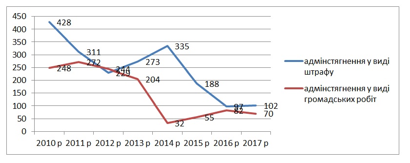 При цьому слід відмітити суттєве збільшення адміністративного стягнення у виді громадських робіт, яке у 2017 році застосовано до 70 осіб або 37,6% загальної кількості осіб, щодо яких винесено постанову про накладення адміністративного стягнення .