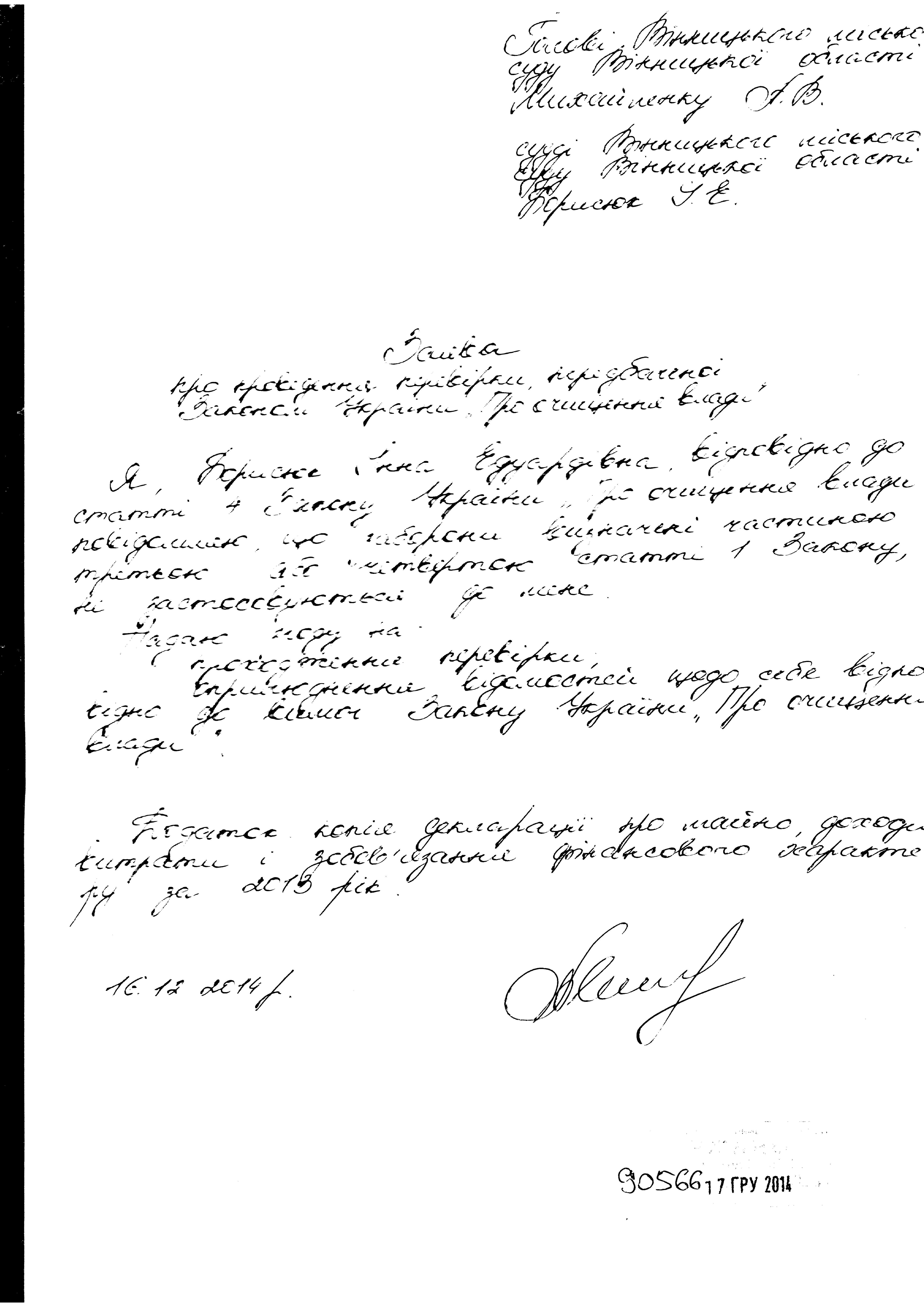 Повідомляємо, що у Вінницькому міському суді Вінницької області розпочато перевірку, передбачену Законом України «Про очищення влади», щодо Борисюк Інни Едуардівни, судді Вінницького міського суду Вінницької області (копії заяви і декларації про майно, доходи, витрати і зобов’язання фінансового характеру за 2013 рік додаються).