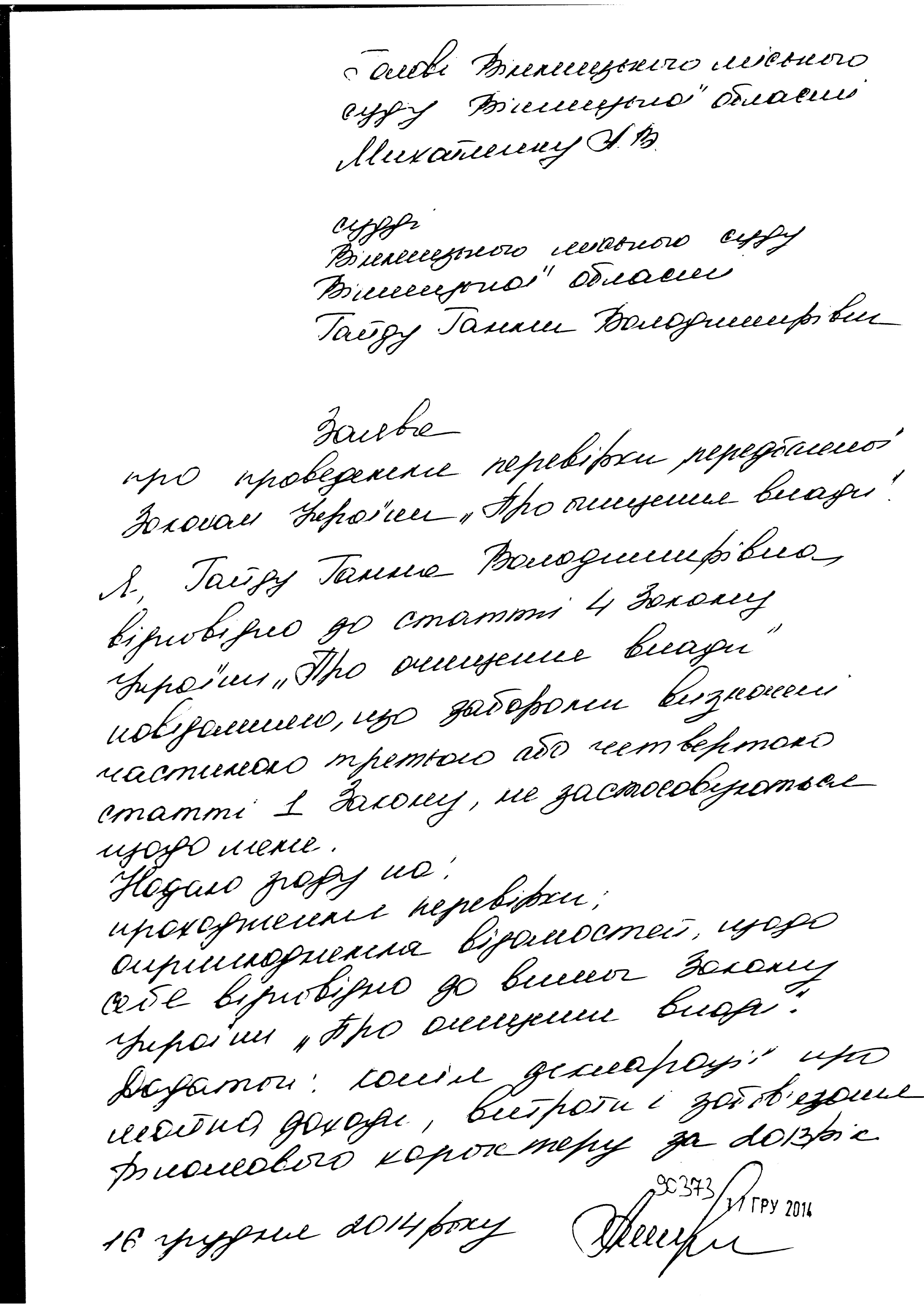 Повідомляємо, що у Вінницькому міському суді Вінницької області розпочато перевірку, передбачену Законом України «Про очищення влади», щодо Гайду Ганни Володимирівни, судді Вінницького міського суду Вінницької області (копії заяви і декларації про майно, доходи, витрати і зобов’язання фінансового характеру за 2013 рік додаються).