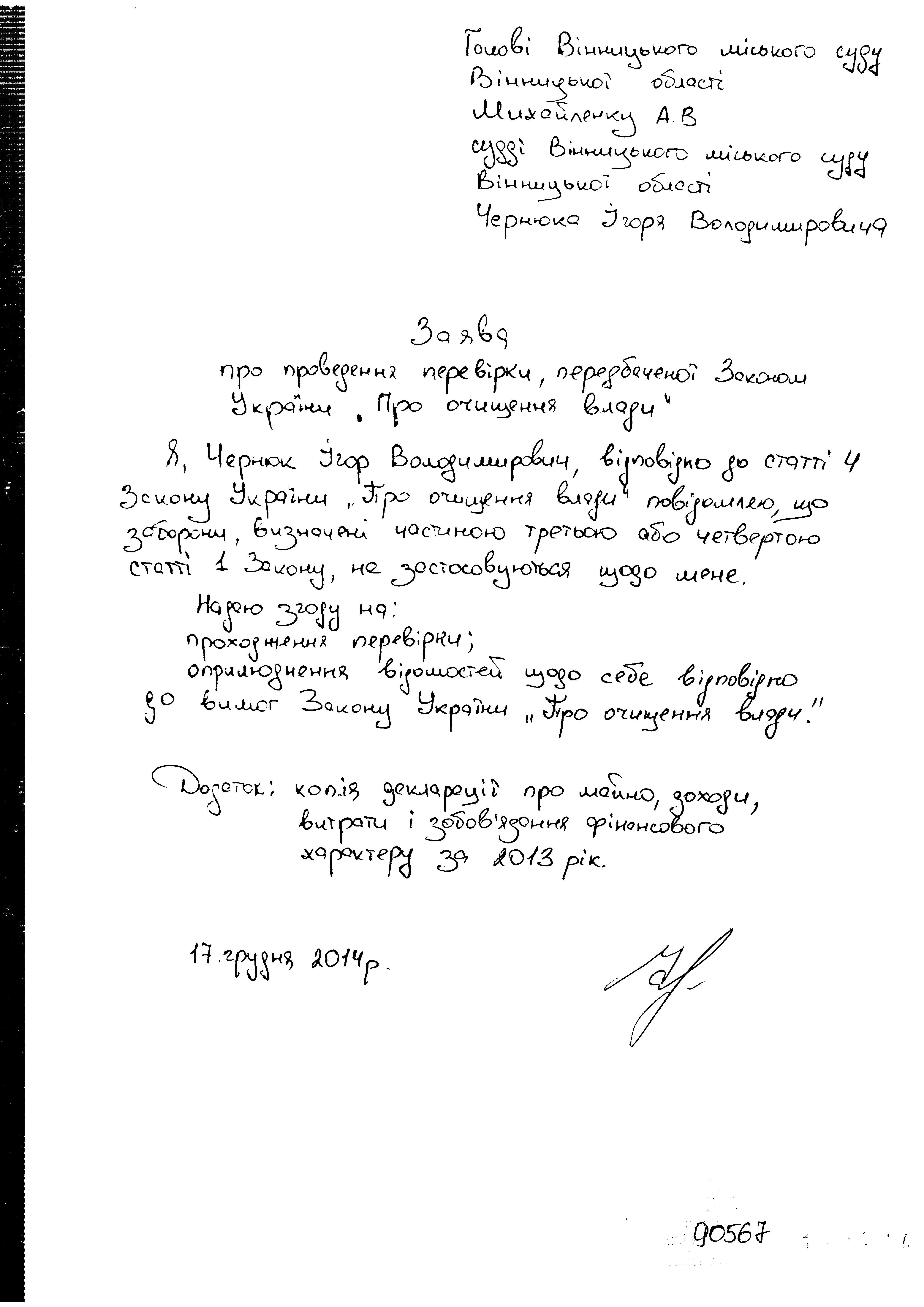 Повідомляємо, що у Вінницькому міському суді Вінницької області розпочато перевірку, передбачену Законом України «Про очищення влади», щодо Чернюка Ігоря Володимировича, судді Вінницького міського суду Вінницької області (копії заяви і декларації про майно, доходи, витрати і зобов’язання фінансового характеру за 2013 рік додаються).