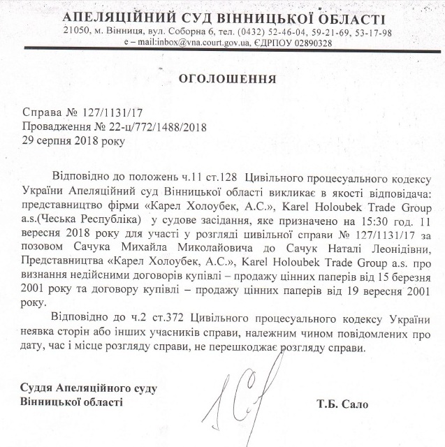 Оголошення про виклик до суду відповідача – представництва фірми "Карел Холоубек, А.С."