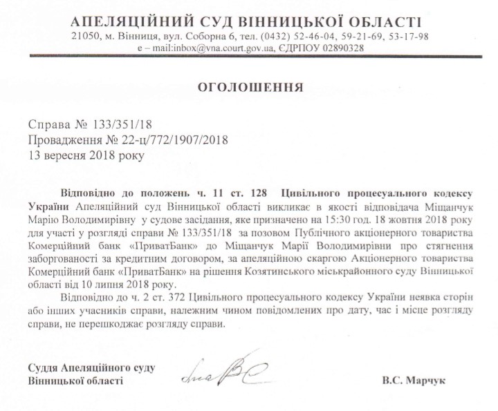 Оголошення про виклик до суду відповідача Марії Міщанчук