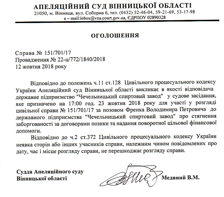 Оголошення про виклик до суду відповідача – Чечельницького спиртового заводу