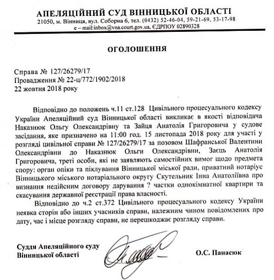 Оголошення про виклик до суду відповідачів Ольги Наказнюк та Анатолія Зайця