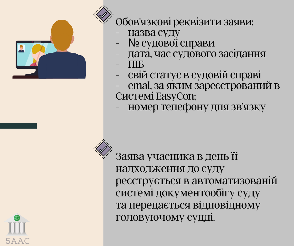 Після реєстрації у Системі "EasyCon" учаснику судового процесу необхідно не пізніше як за 5 днів у будь-який спосіб подати до відповідного суду заяву.