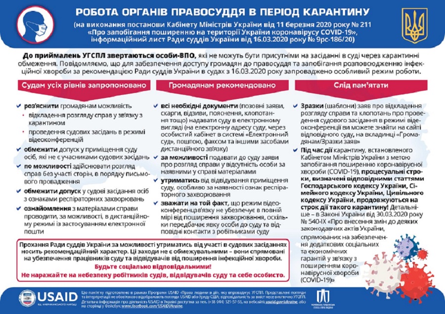 Українська Гельсінська спілка з прав людини в рамках Програми USAID Ukraine - USAID Україна «Права людини в дії» підготувала пам’ятку про роботу органів правосуддя на час карантину.