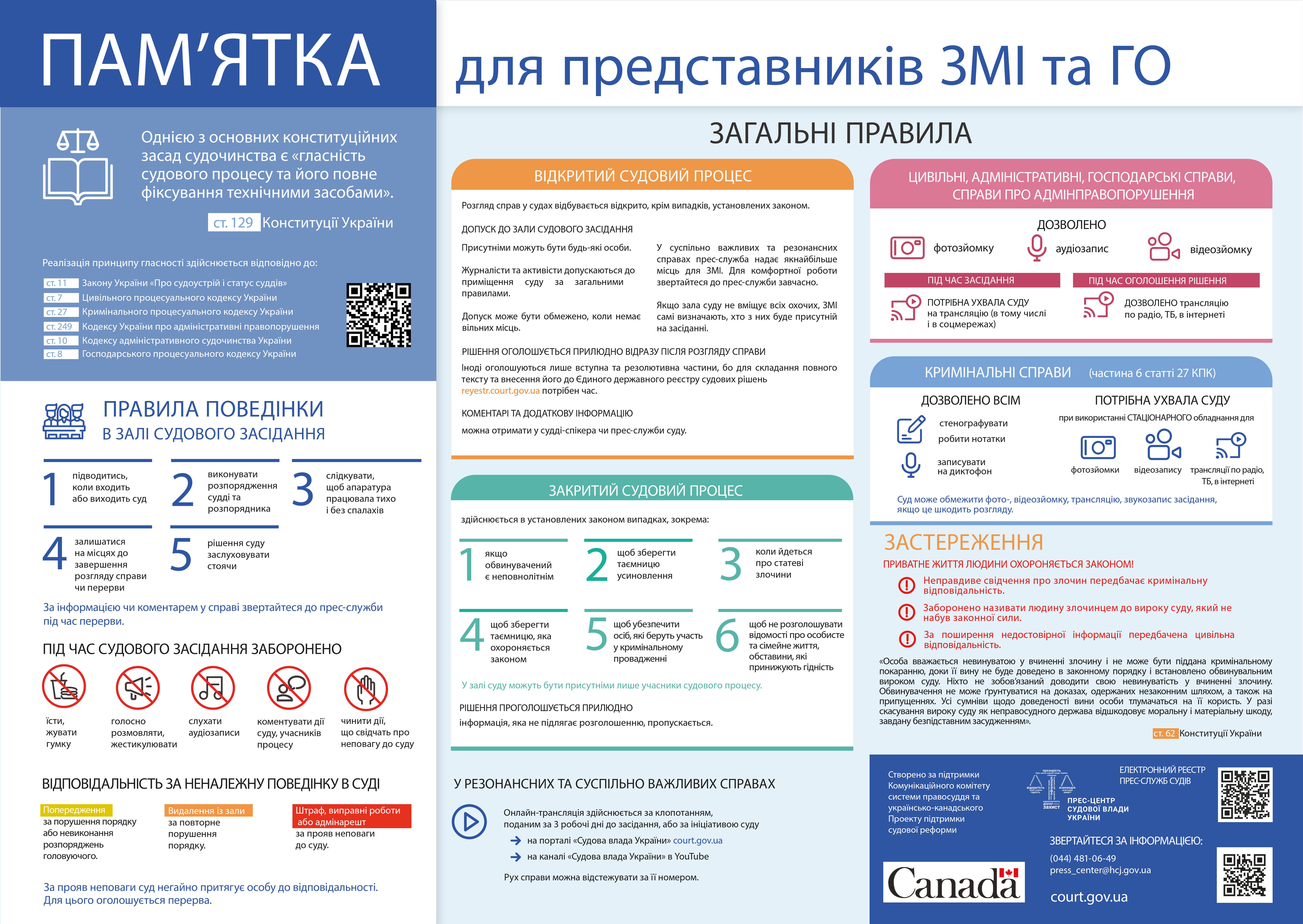 Оприлюднено єдину Пам’ятку для представників засобів масової інформації та громадських організацій, створену за підтримки Комунікаційного комітету системи правосуддя та Українсько-канадського Проекту підтримки судової реформи в Україні.